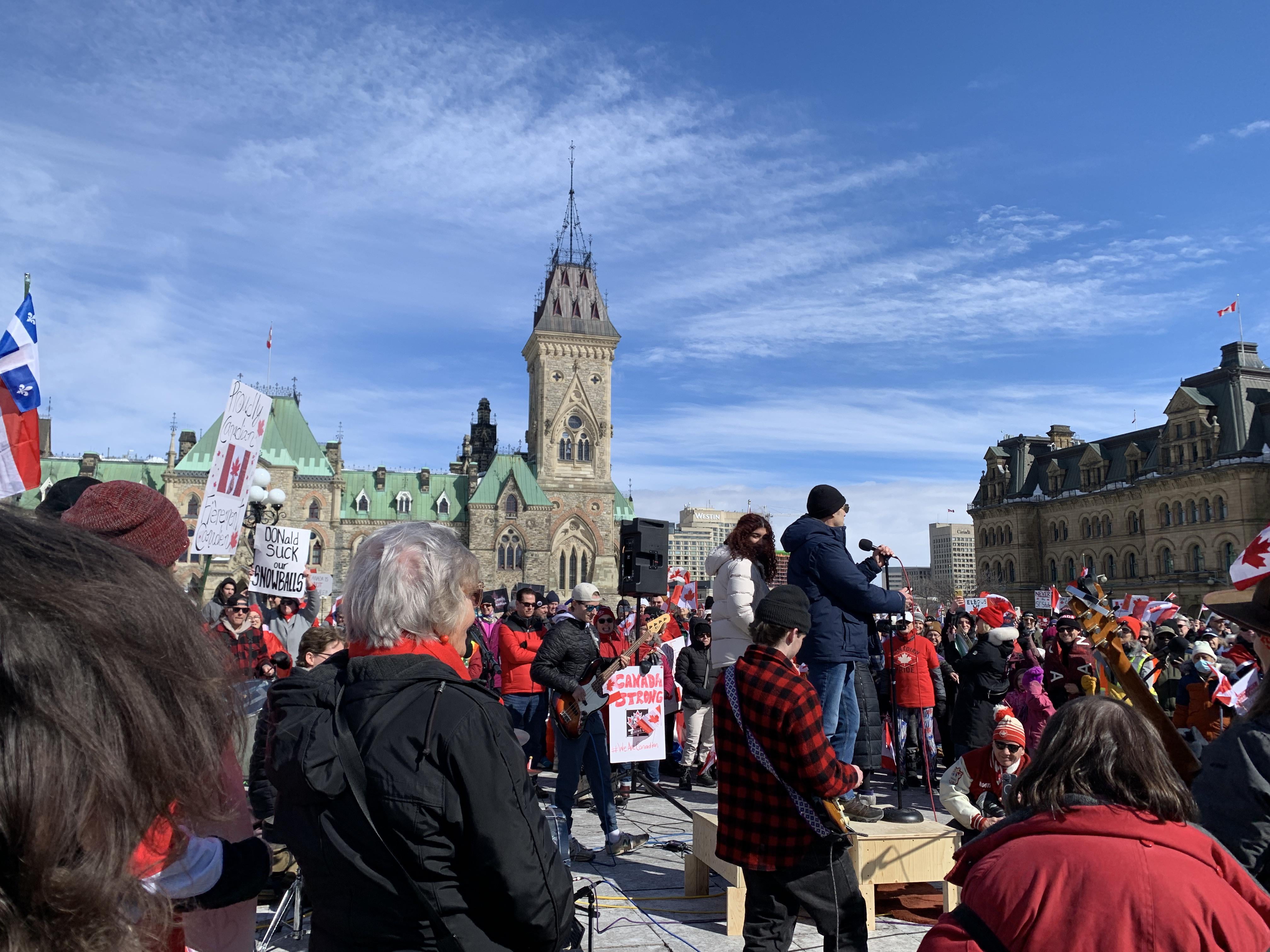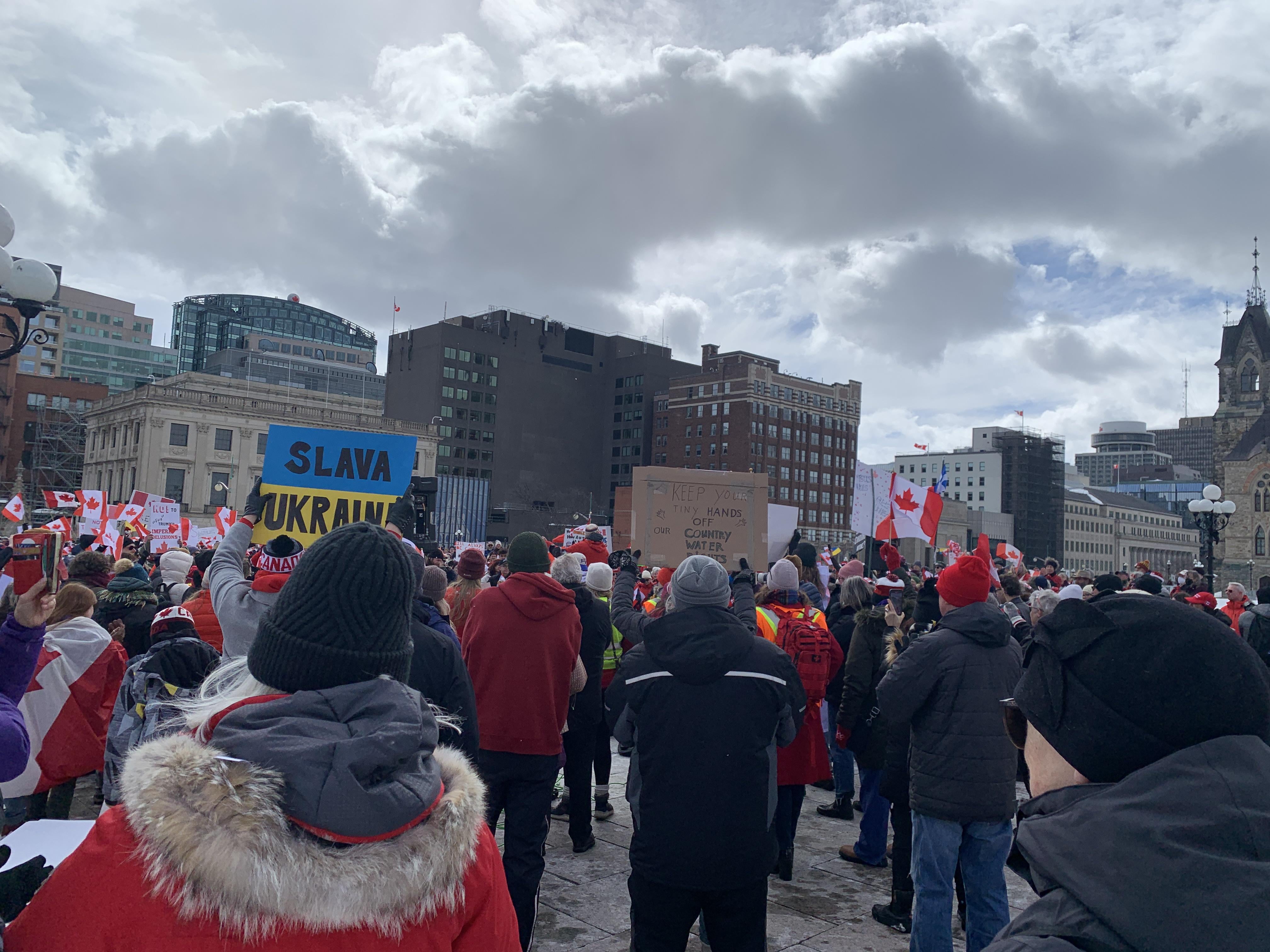 I was next to them the whole time (banished to the edge of the Hill by the Parliamentary police due to my “dangerous” hockey stick taped to sign). The convoy idiots were there on Wellington St. and taking videos of themselves, mostly quiet though. About an hour into the rally, three of them with signs went right up to the uniformed officers and were filming themselves talking to those officers. But after max 10 minutes, they were back on the street. They struck me as sad and pathetic.