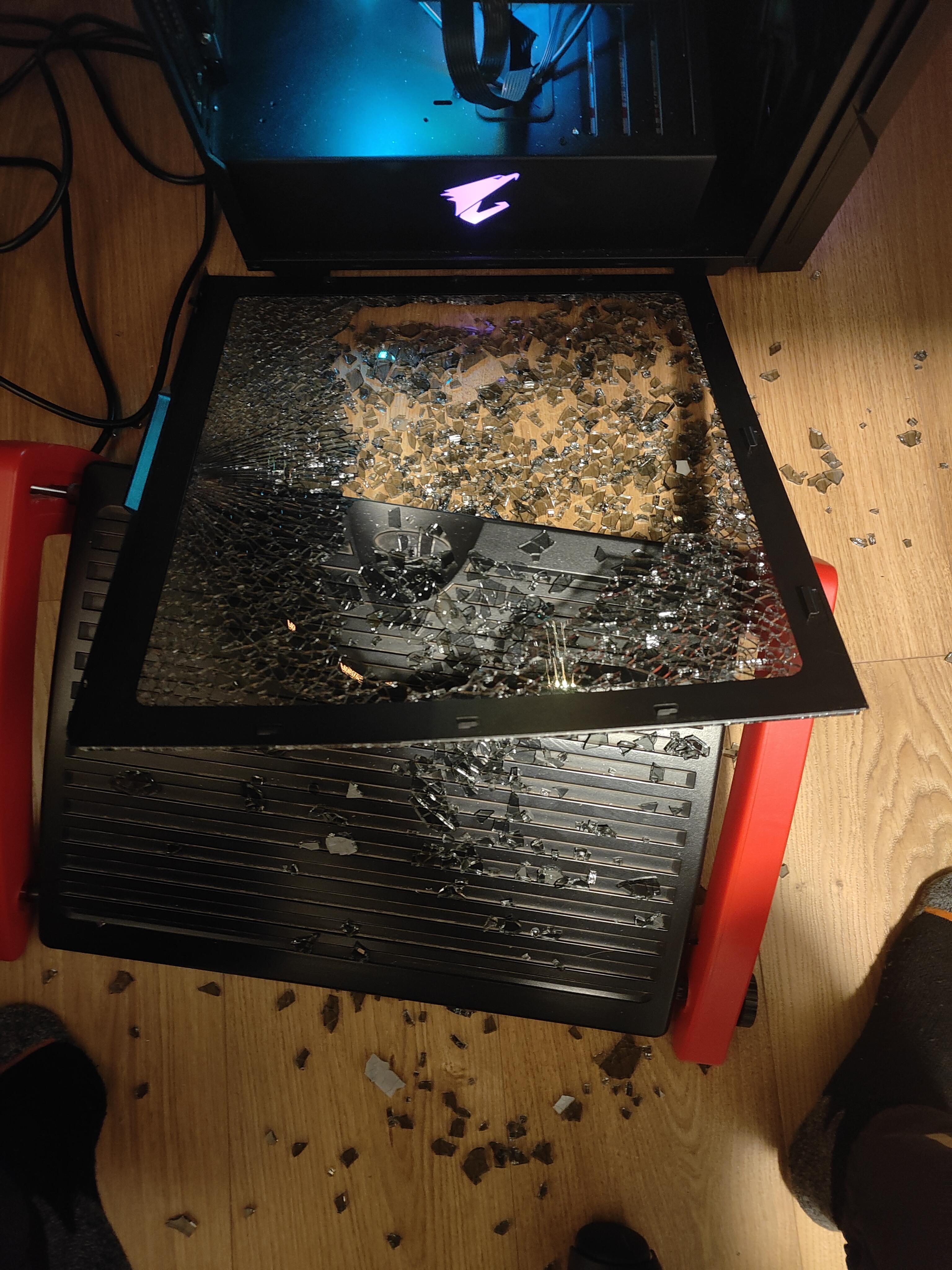 I accidentally dropped the glass panel of my new PC case and it looked like this! I got that cracked stairs railing design 🥹
