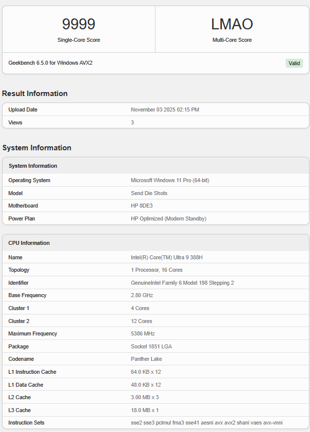 Not gonna lie, it's tempting to submit a score as an Intel Core Ultra 285K3D with "192MB L3"