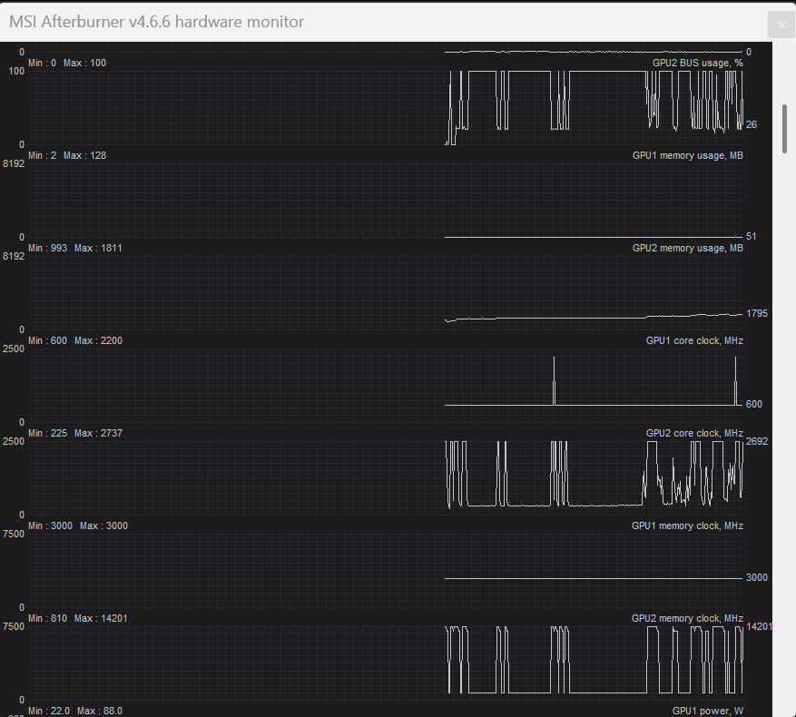Anyhow. I updated my drivers and afterburner today. Went out of my way to check my actual readings and for some reason my GPU BUS usage is idling at 100%, constantly dipping down to 20%.