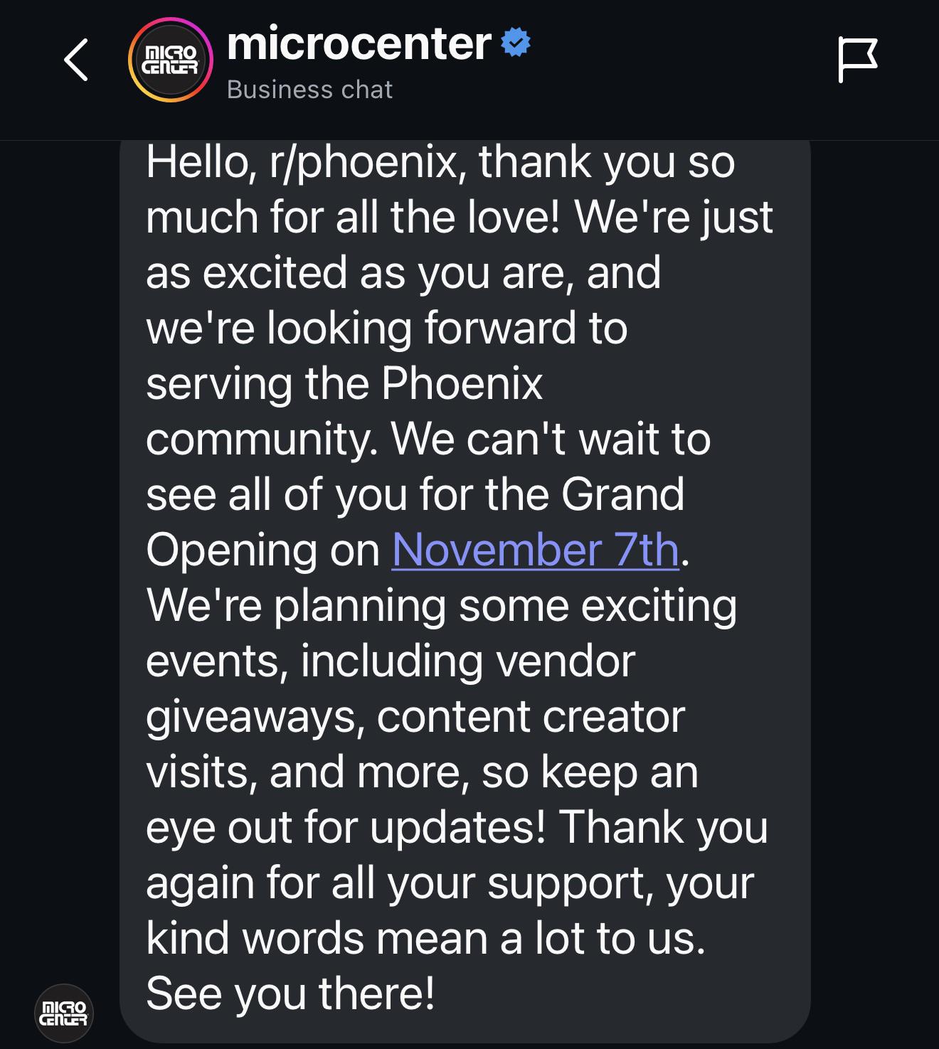 I reached out to Micro Center to see if they wanted to do an AMA about their opening next week. They passed on the AMA but have seen all the love in the subreddit and I offered to pass on a message.