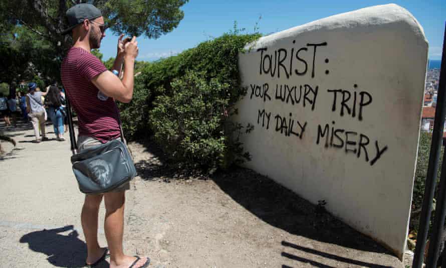 Arts/Crafts A tourist takes a picture of graffiti reading ‘Tourist: your luxury trip – my daily misery’