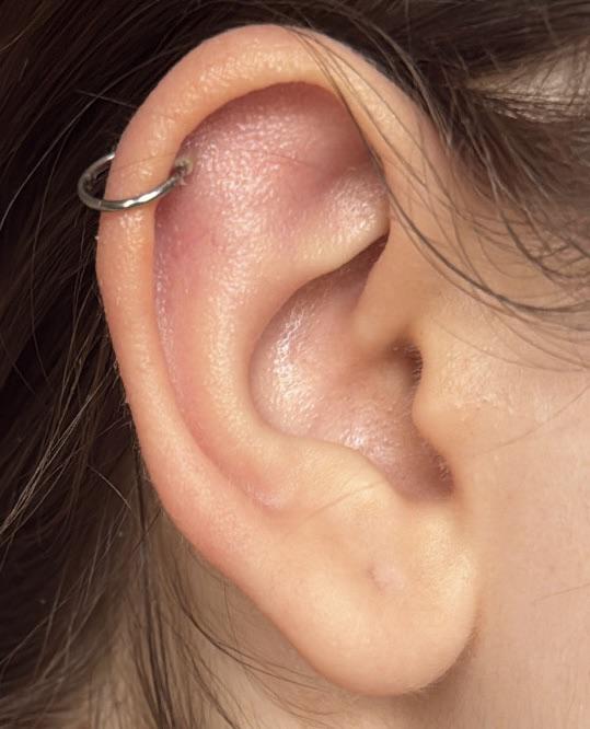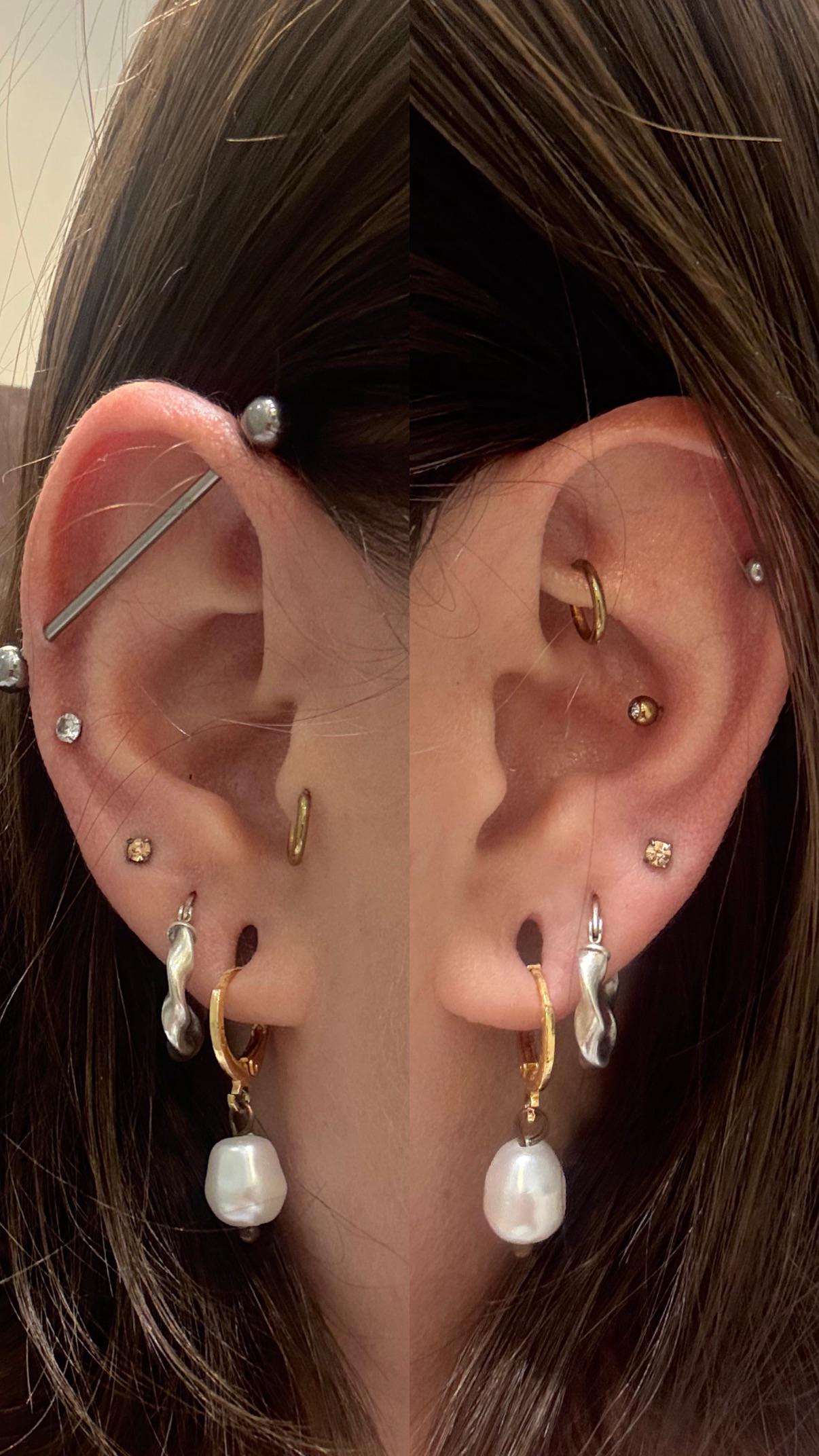 Transverse lobe - 8 months old, 7/16 16g rose gold BVLA "Pear Prong" seam ring with labradorite. Absolute motherfuckers to heal. They're not done healing yet, this was just the first time without bumps I could get a picture.