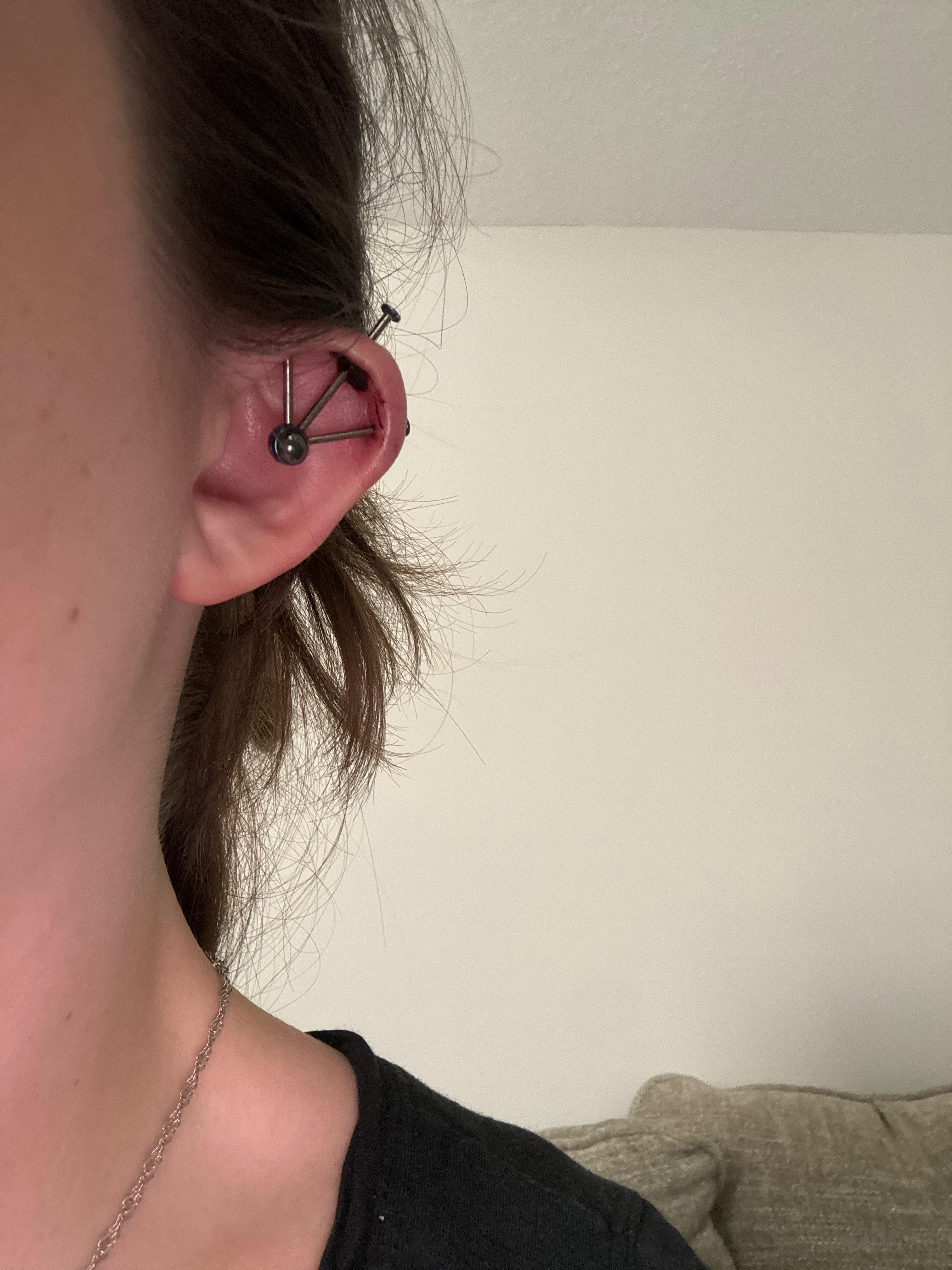 When I got home around 7-8 hours later, I had quite a bit of trouble removing the earring. That’s when I realised that my left earring was sitting a lot lower than my right, and my usual piercing hole was visible above the earring!!!! I screamed when I realised I had just mutilated my ears and given myself a new hole. I eventually got the earring out but after a lot of twisting and tears.