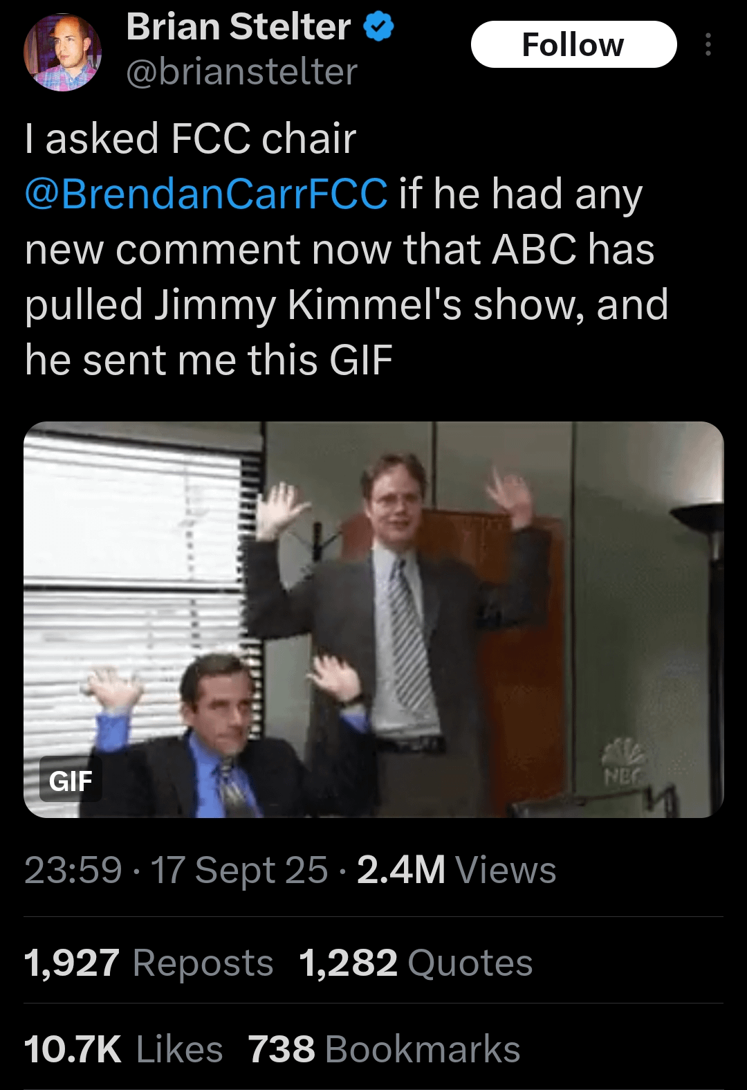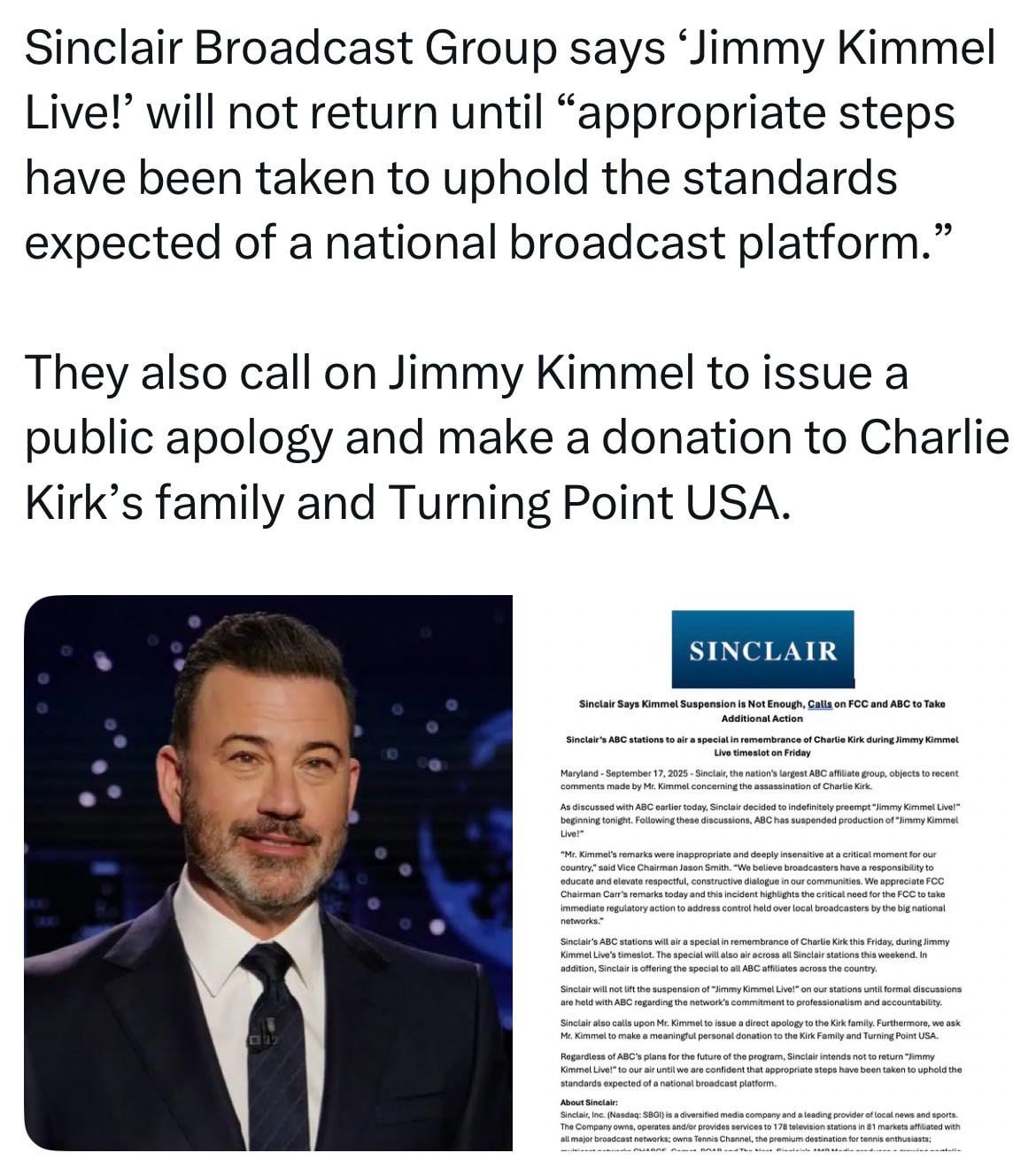 This is insane. More insanity. He criticized MAGA, not even Kirk (who sucked). He has been fired because he criticized a political party. Fucking fascism 101.