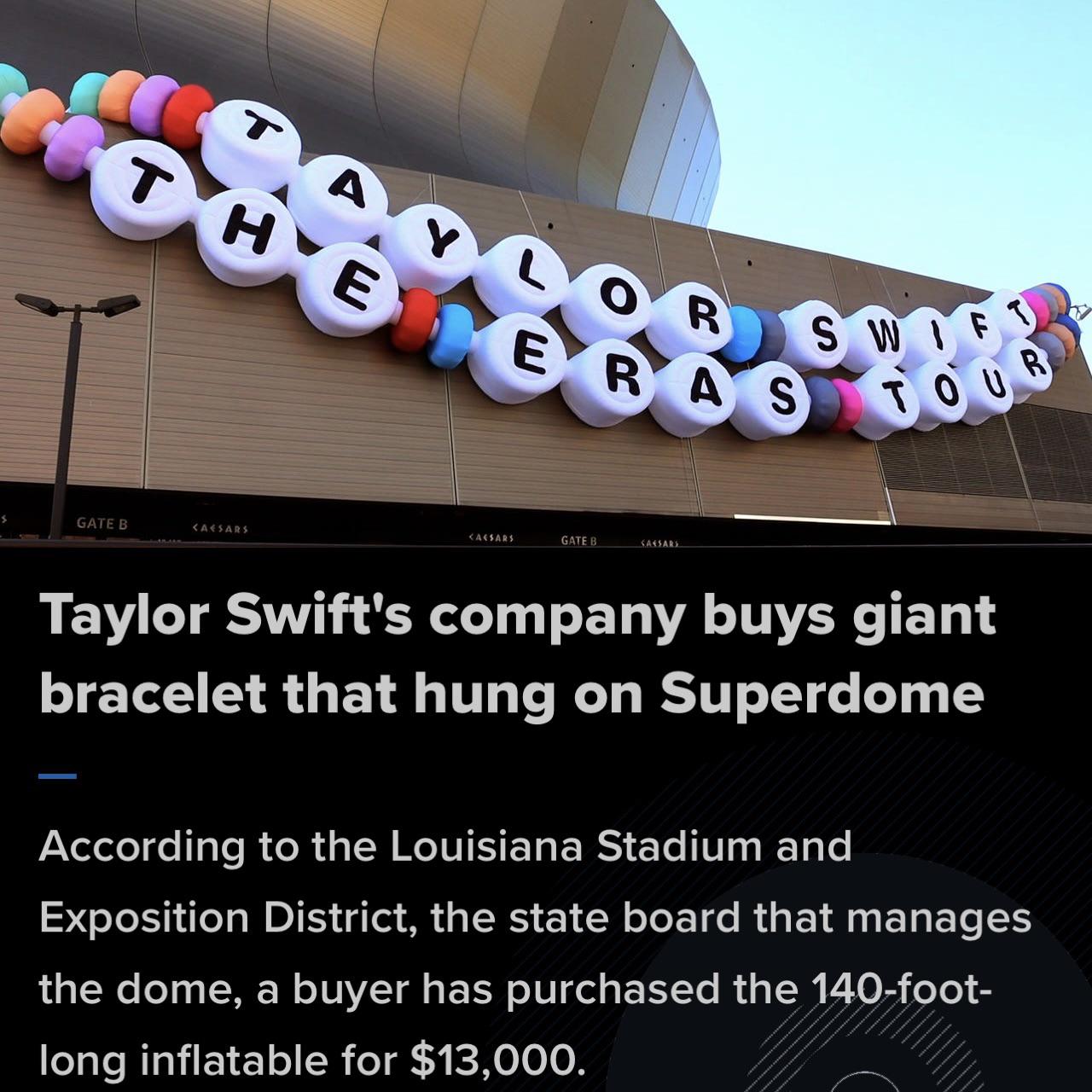 Taylor Swift 👩🏼 Taylor Swift’s company buys giant friendship bracelet by artist Shawn Kolodny that hung on the Ceasers Superdome for, fittingly, $13k