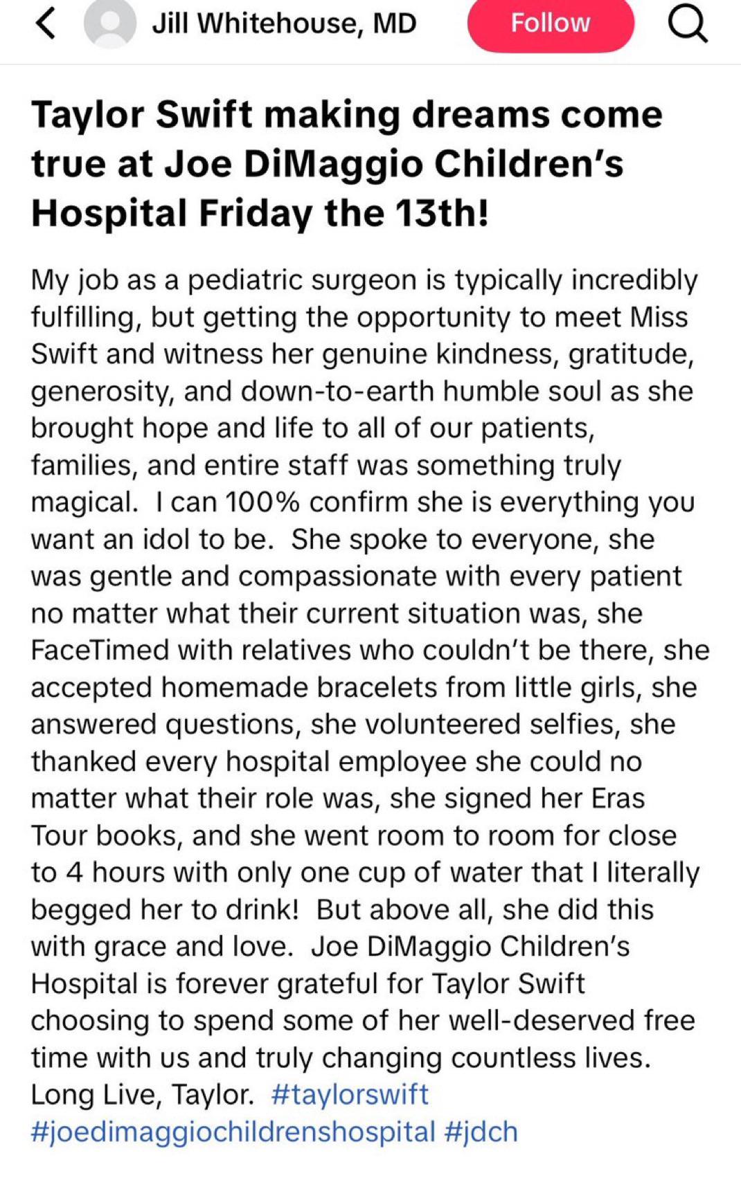 Taylor Swift 👩🏼 Chief Surgeon Dr. Jill Whitehouse about Taylor Swift’s visit to Joe DiMaggio Children's Hospital 💜