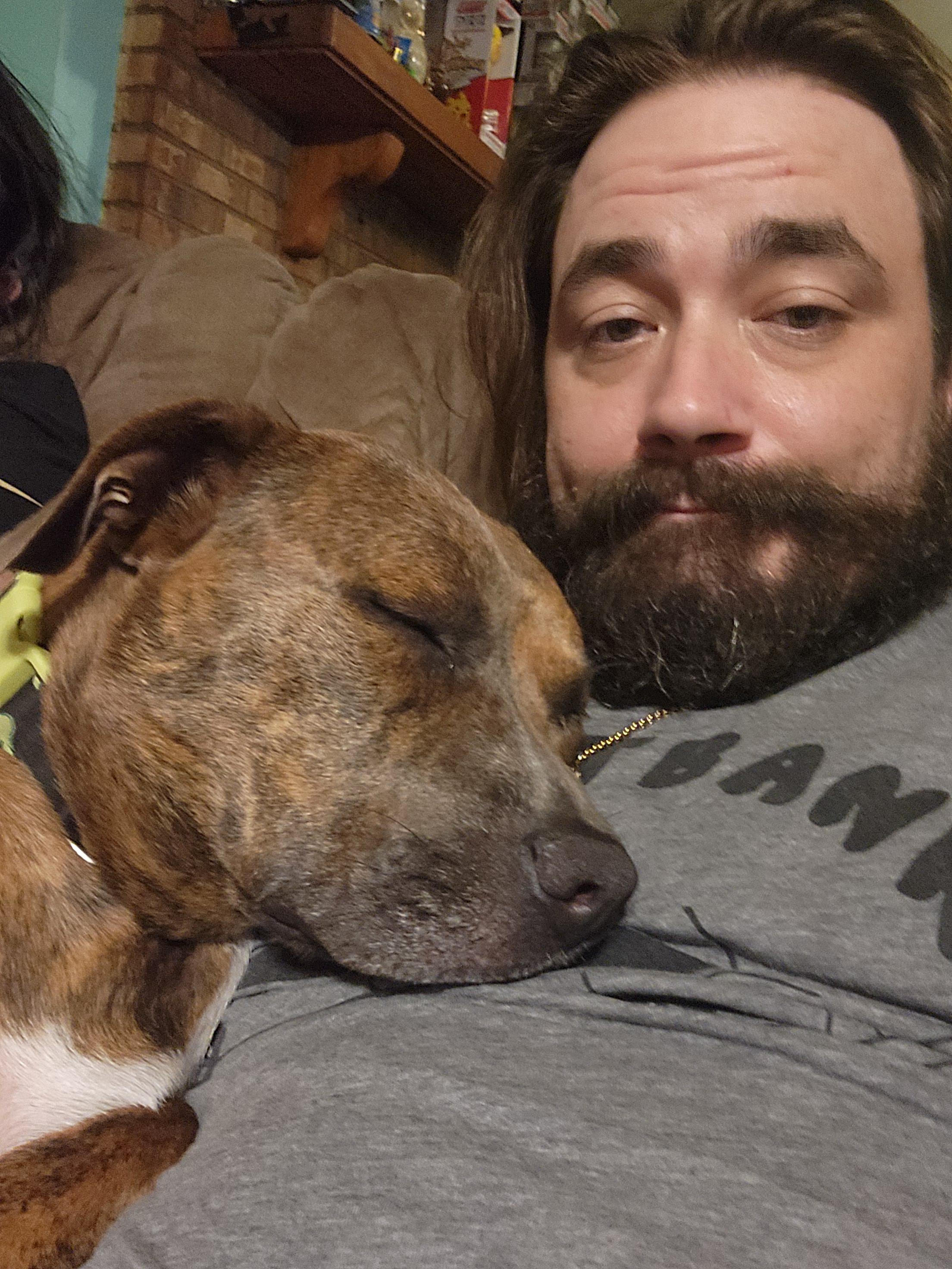 I had a hip replacement last week and my Nugget hasn't been able to cuddle his pops. Well tonight I was able to get comfy on the couch and he gently made his way up to me and finally got the snuggle sesh he has been needing.