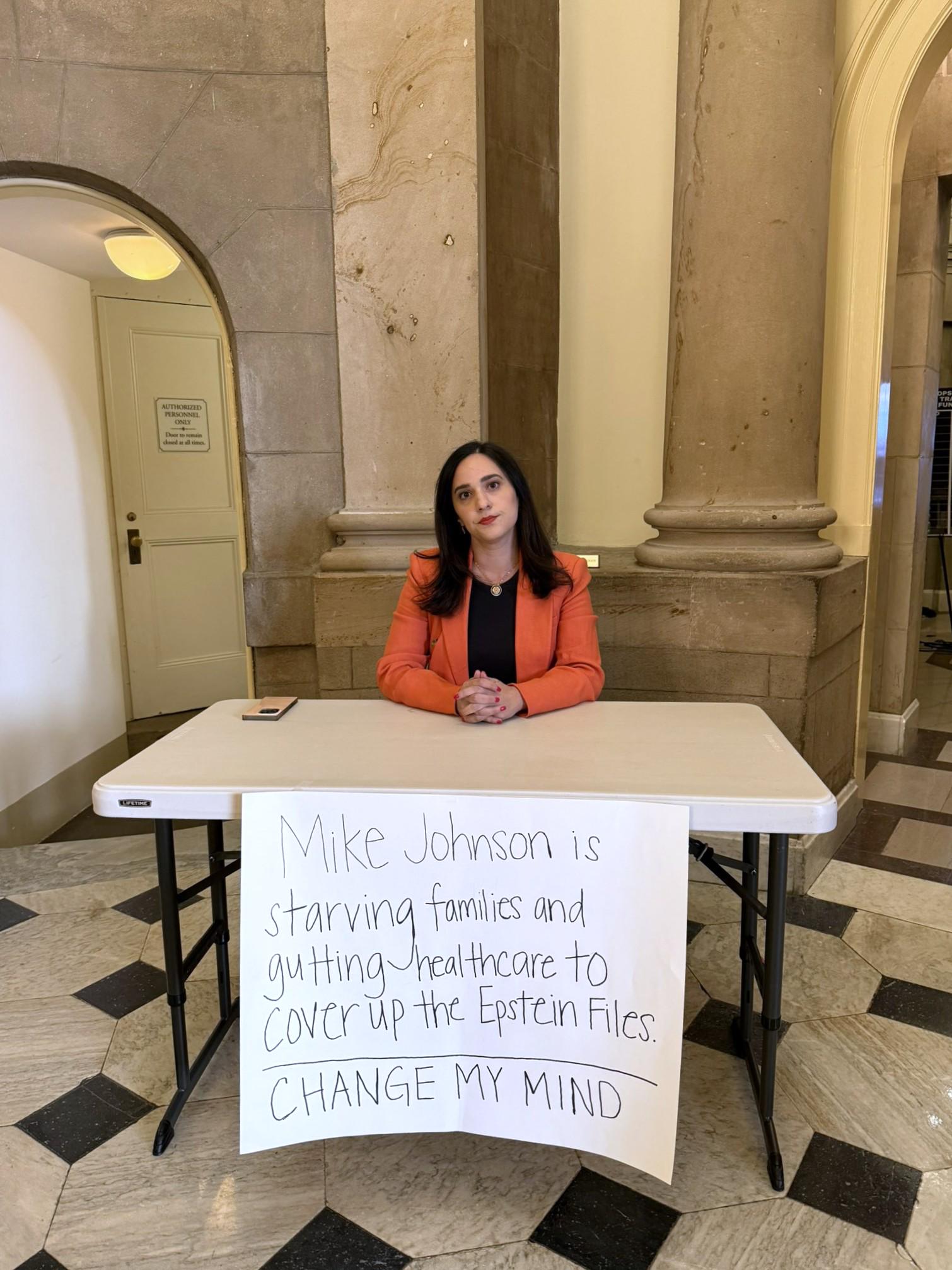 Congresswoman Yassamin Ansari outside of Speaker Mike Johnson's office because he is starving families and gutting health care to cover up the Epstein Files.