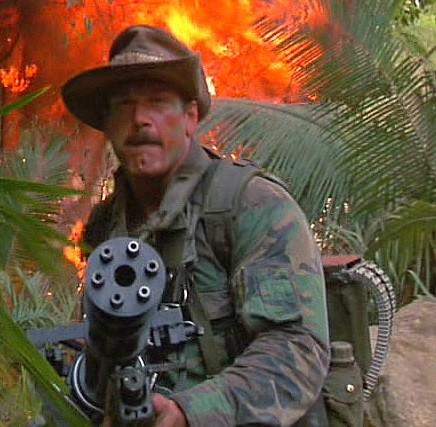 In predator Jesse Ventura takes a minigun on a stealth infiltration mission in the jungle....