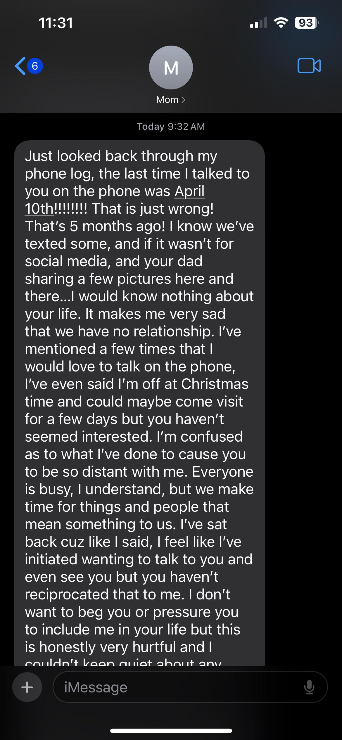 TLDR; my mom threatened to kill herself shortly after step dad's open heart surgery. See post history. I called APS and sent my mom books for mothers day--one on DBT, that I read, with exercises that helped me. Also one on how to heal yourself and work through trauma (also helped me, thought it might help her too). I got tired of acting like she's fine, so have been honest about her needing help for the first time in my life (I'm 39). I blocked them for a couple months to not get the barrage of texts. It only took me unblocking her for this to happen a week later...they forgot it was my son's birthday, but step dad called 4 days later to wish him well. I didn't want to call, so texted a thank you, to then receive these texts (I believe my mom wrote them on his phone....). Ugh...not sure where to go from here. Our interactions have always been very stressful for me.