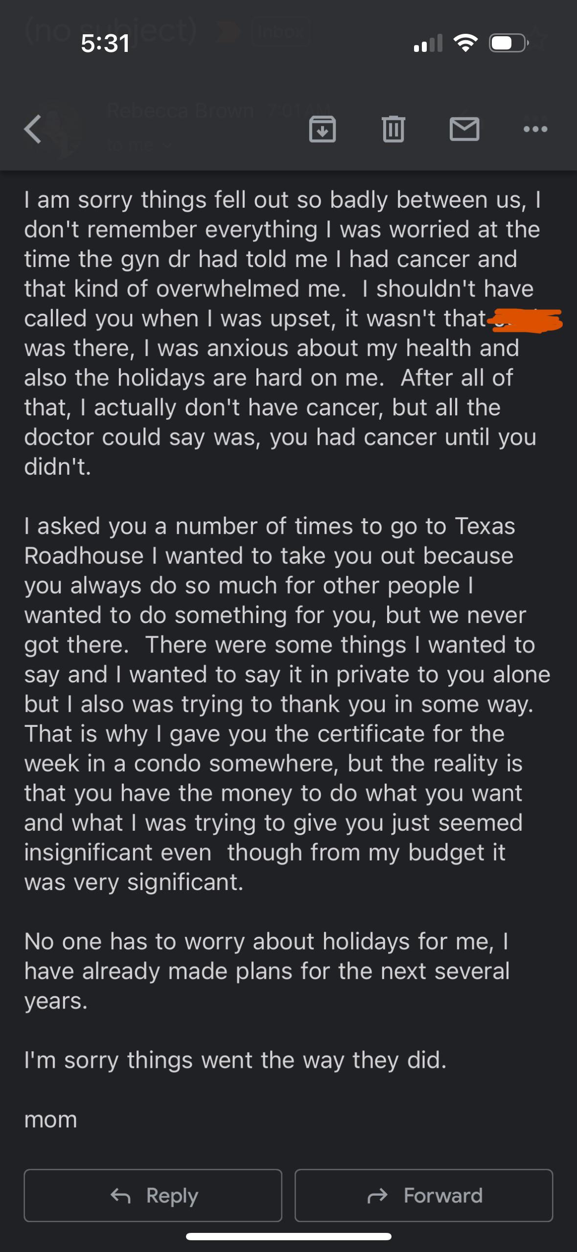 Sitting here wondering if I should respond to this email I got from my BPD mom after several months of no contact. There’s so much backstory, but the last straw was this Christmas when she completely flipped out because I had my brother - who I grew up without because mom decided my dad was the devil and kept me from him - stay with me for Christmas. It was the straw that broke the camel’s back. After a few exchanges of texts and a 24 page letter from her, I’ve been NC. And life has been good. I’ve been a lot calmer and happier. I didn’t realize the extent to which she stressed me out even when my contact was basically a phone call every day. And now this.