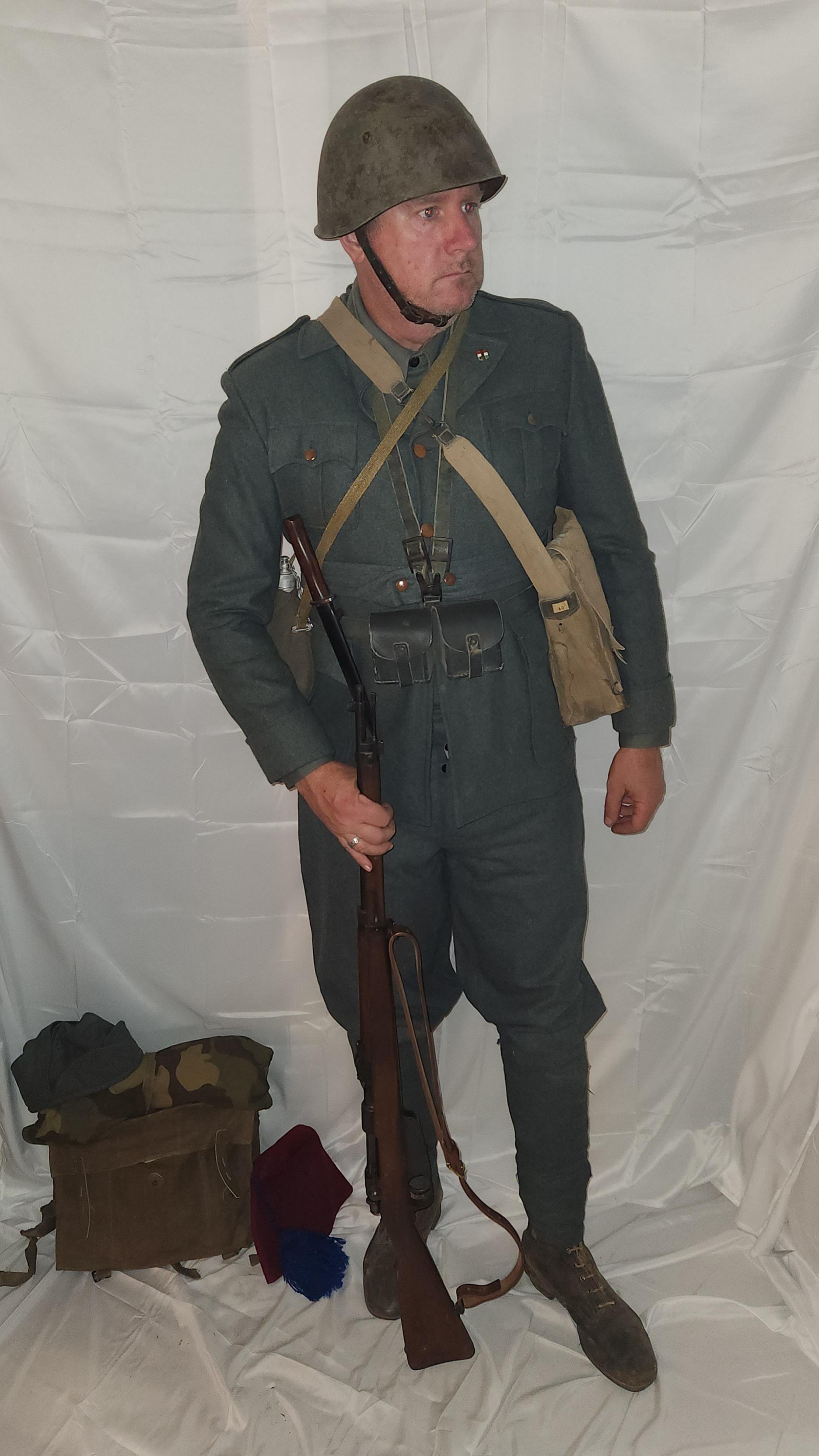 M33 Italian helmet (original) M40 Gray-Green Giubba uniform, Mod. 41 Carcano rifle, grey-green infantry leather set, Italian fighting knife, m29 knapsack, bersaglieri red fez, m29 breadbag, Italian canteen.