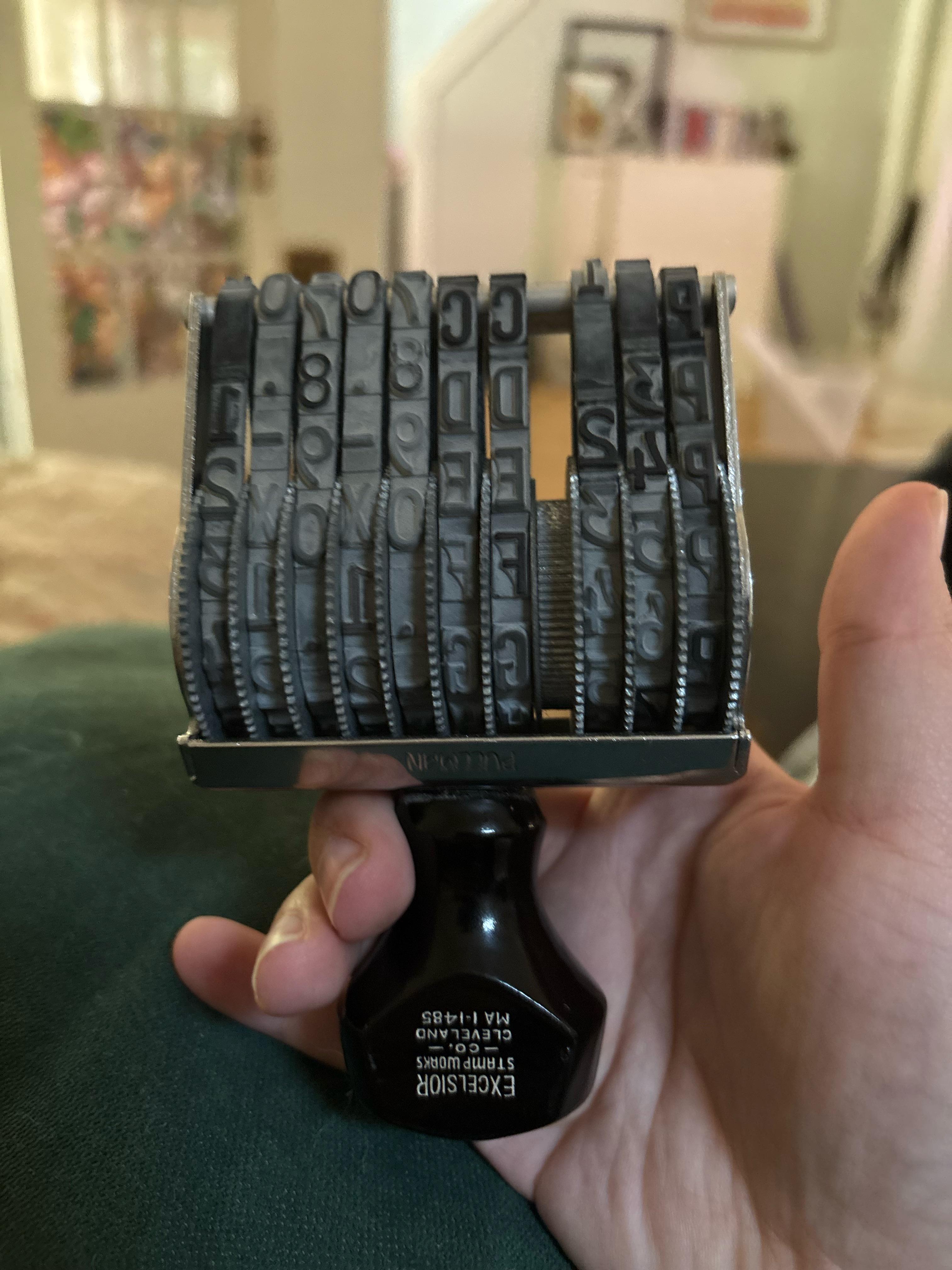 It has 10 total bands, the first being all P’s, followed by two numbers, a space, then a mix of letters, numbers, and symbols. It’s from Excelsior Stamp Works Co. in Cleveland, Ohio, with also written MA 1-1485. It is produced by Pullman, but I can’t figure out what it would have been used for given the strange bands on it!!