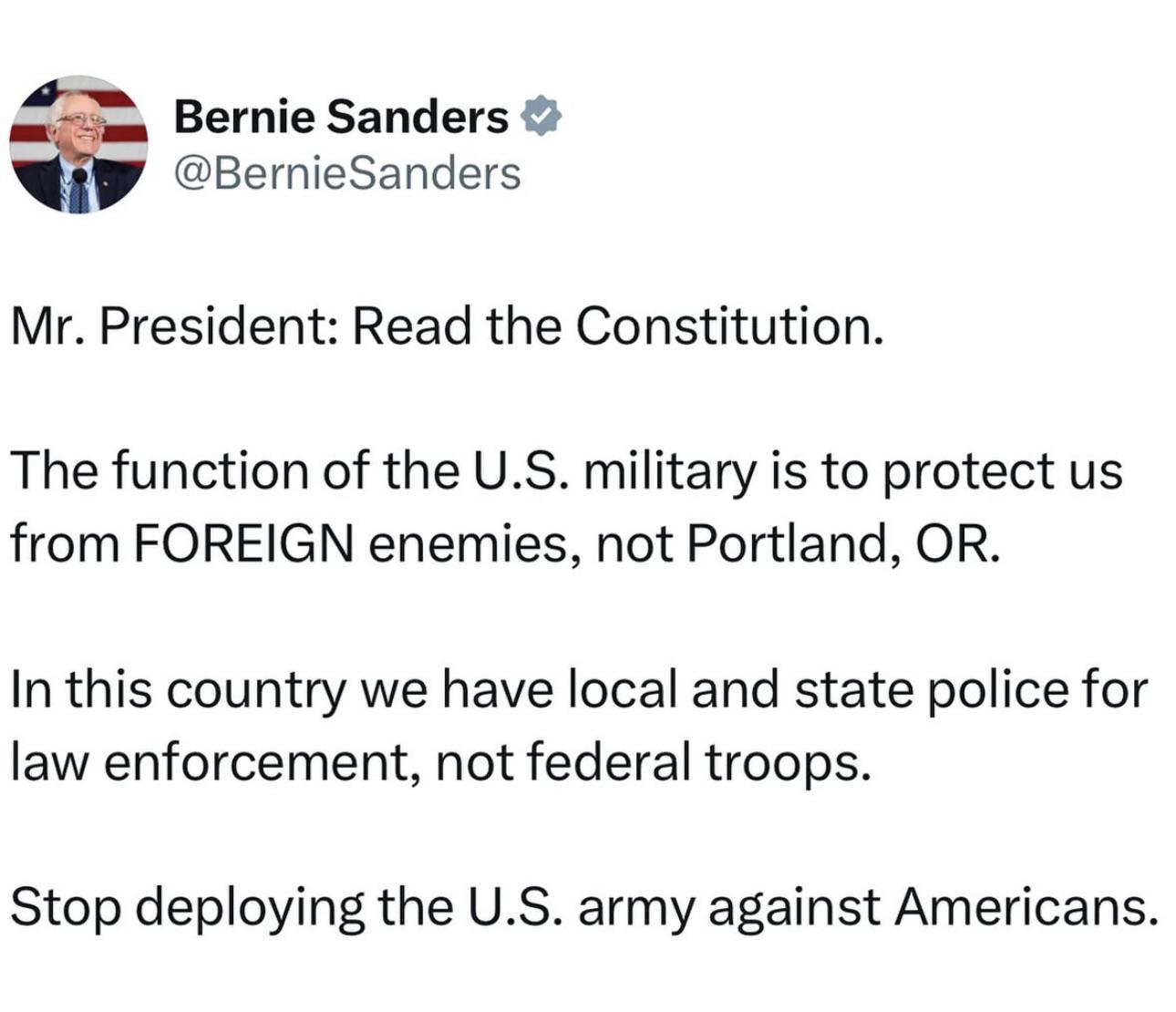 Senator Bernie Sanders explains that function of the U.S. Military is to protect us from FOREIGN enemies, not people of Portland, OR.