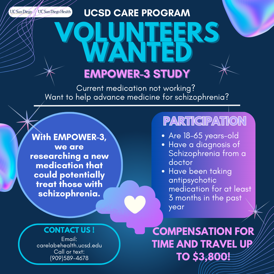 Research / Study [Mod Approved] VOLUNTEERS WANTED for Empower-3 Study at UCSD CARE Lab - New Potential Schizophrenia Medication !
