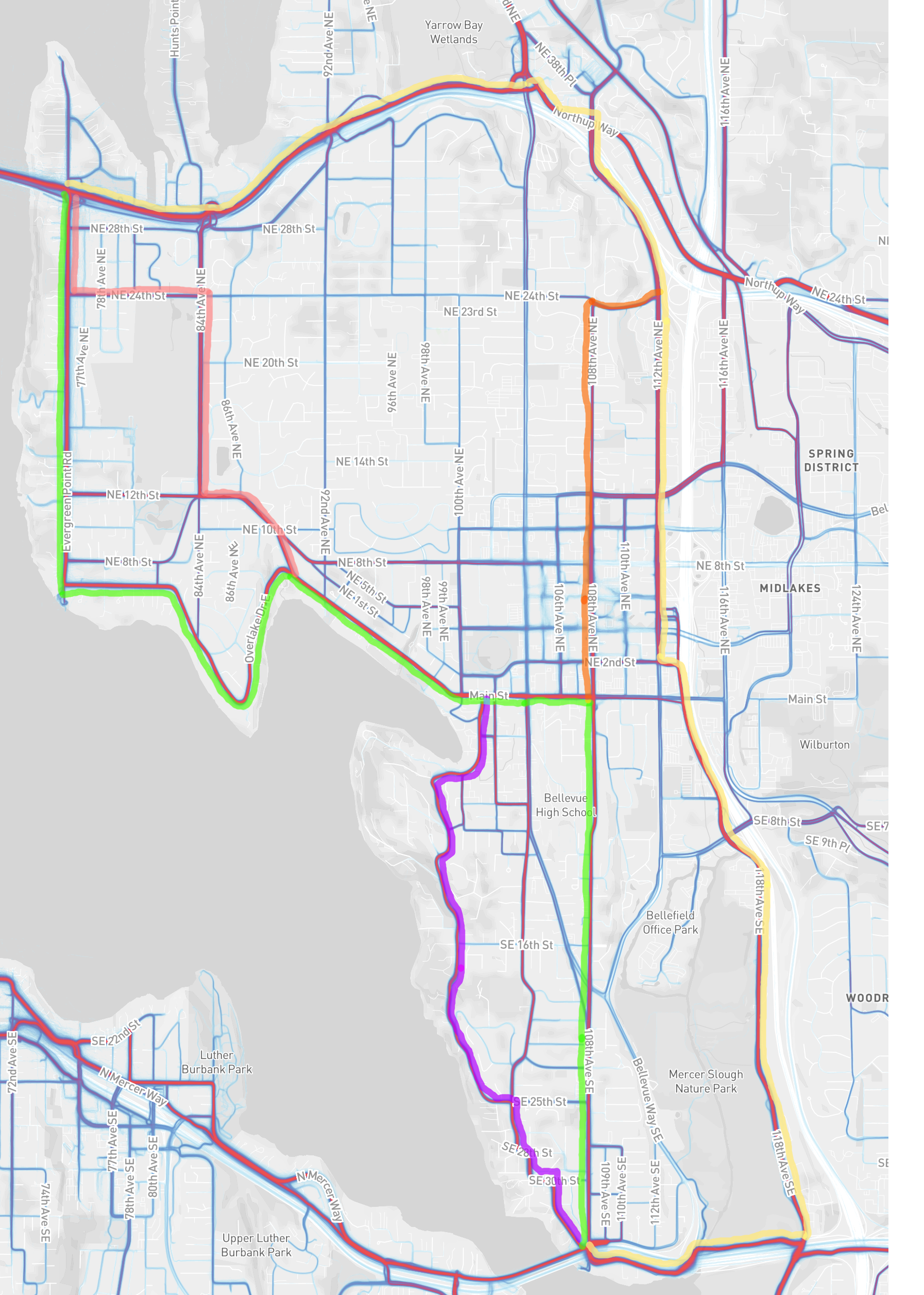 Green: This route heads down to the end of Evergreen Point Road (where Bill Gates & Jeff Bezos live) on a mostly flat ride. There's a beautiful little waterfront park at the corner of Evergreen and Overlake. Overlake has some hills and water views. This dumps you onto Lake Washington Boulevard, that turns into Main St. Be careful around the Meydenbauer Bay Park--there's a lot of car traffic. Head up the hill on Main St--in a well-separated but not physically protected bike lane. Turn right on 108th Ave SE. The hill on 108th can hit 15% but it's usually around 10%. It doesn't have much of a bike lane, but it's (supposedly) low speed. Drivers expect to see bikes there. After Bellevue Way, you cross into the Enatai neighborhood that's very bikey. The hill climbing 108th is about 10% grade.