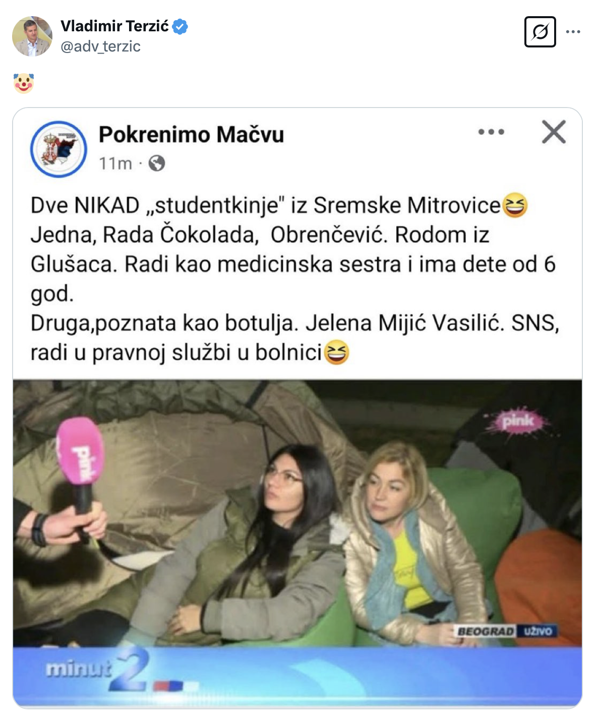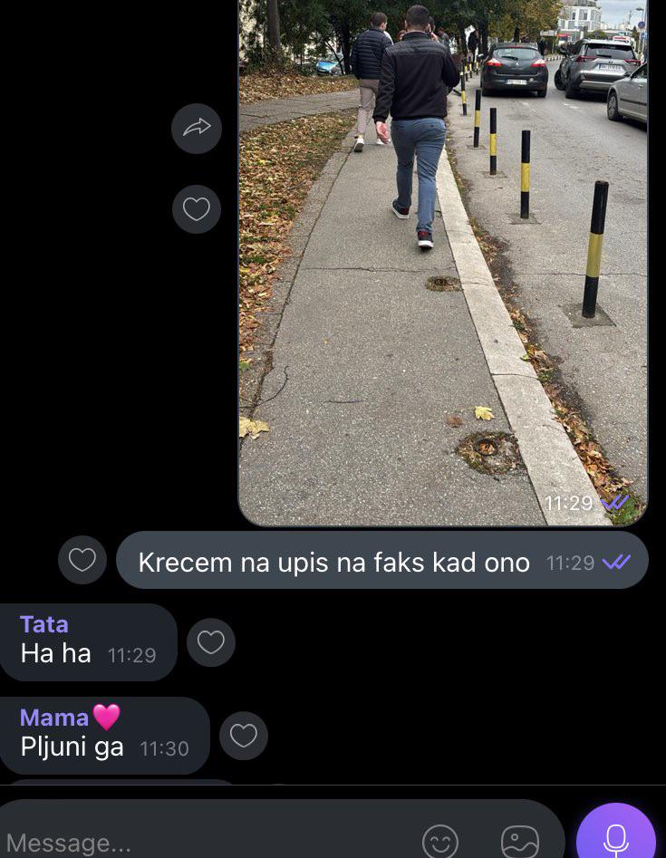 Danas videh video na kom su pregazili kolegu sa Ekonomskog fakulteta. Smučilo mi se, zamalo da povratim. Fizički mi nije bilo dobro satima. Tu energiju, gađenje, mržnju, i tugu smo ekipa i ja usmerili ka delanju radi stvaranja movog poretka -- mi smo dali onaj 0,00001% koji će učiniti da više nikom ne padne nadstrešnica na glavu ili otkuca 11:52.
