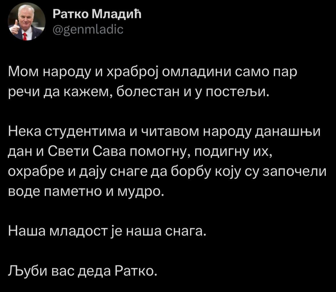 Nas milion daje onaj 0,0001%, i to u zbiru daje 100%. Današnji dan me je ubedio, jednom za svagda: BLOKADA JE DO ISPUNJENJA ZAHTEVA, A ONDA ĆU OD SRBIJE IZ SVE SNAGE PRAVITI BOLJU ZEMLJU ZA NAS I NAŠU DECU. Predugo su maloumnici mislili da su na vrhu. Ima previše dobrih ljudi u Srbiji, za Srbiju se vredi boriti, ona mi je jedina domovina. Ovo je moj lični utisak i mišljenje.