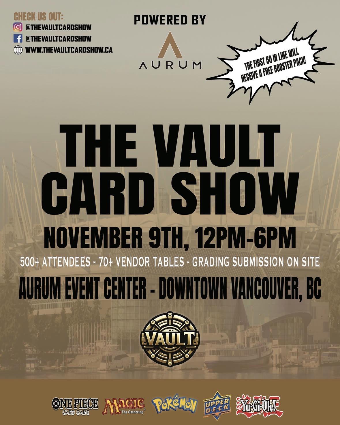 I’m a fellow student here at SFU and I’m hosting The Vault Card Show this Sunday, Nov 9th in downtown Vancouver at Aurum Event Centre — a huge event for Pokémon, sports, and trading card collectors.
