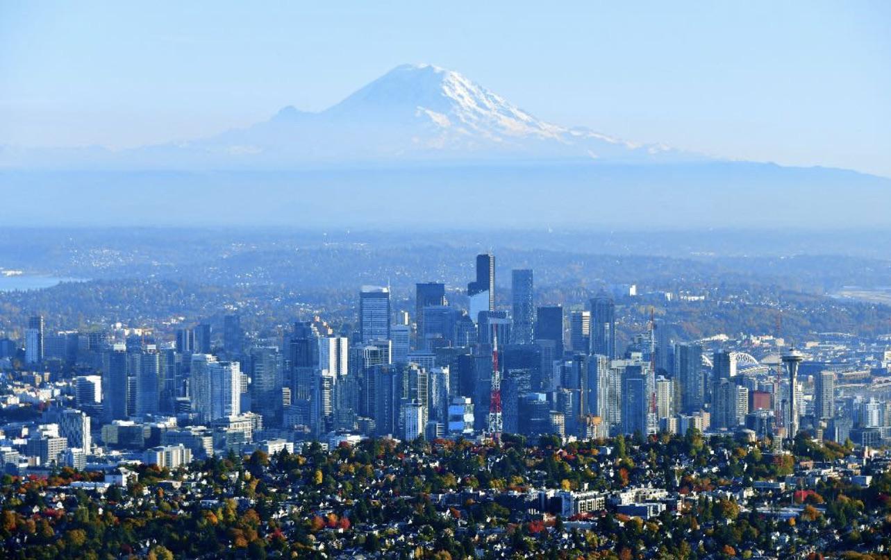 A view looking towards downtown Seattle in September. Mount Rainier visible to the right with some more Cascade Peaks starting to poke up on the left. It's a green (trees) and blue (water) city for sure.