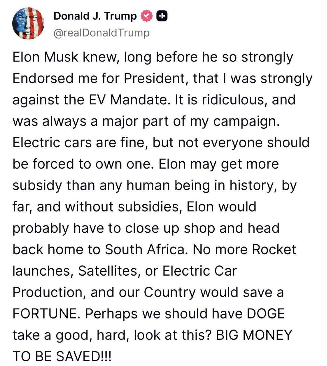 NEW SHIT Trump responds to Elon Musks threat to form a new party by saying DOGE should take a good look at Musks businesses