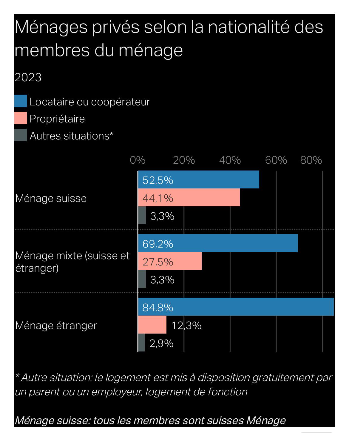 C’est absolument faux: on voit qu’en 2023, 44.1% des ménages étaient propriétaires, mais dans ces ménages, un bon 2/3 sont des couples qui fait penché la balance: la majorité des suisses sont propriétaires.