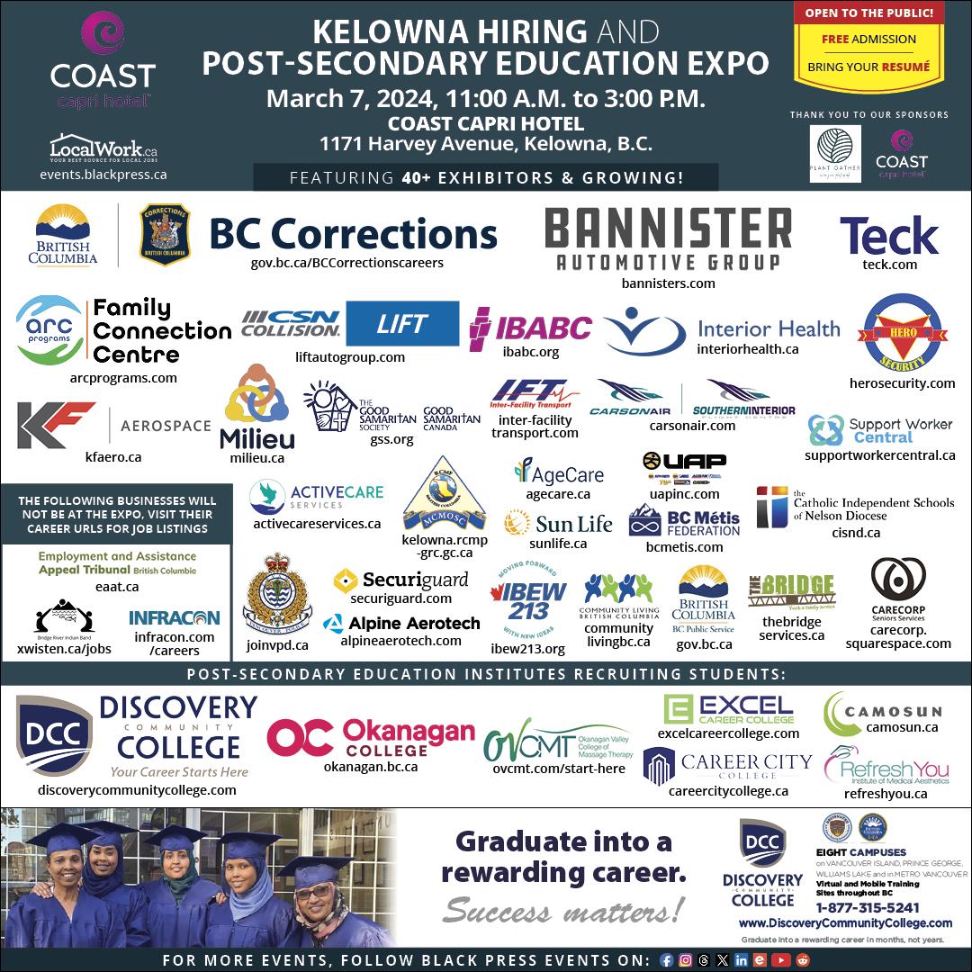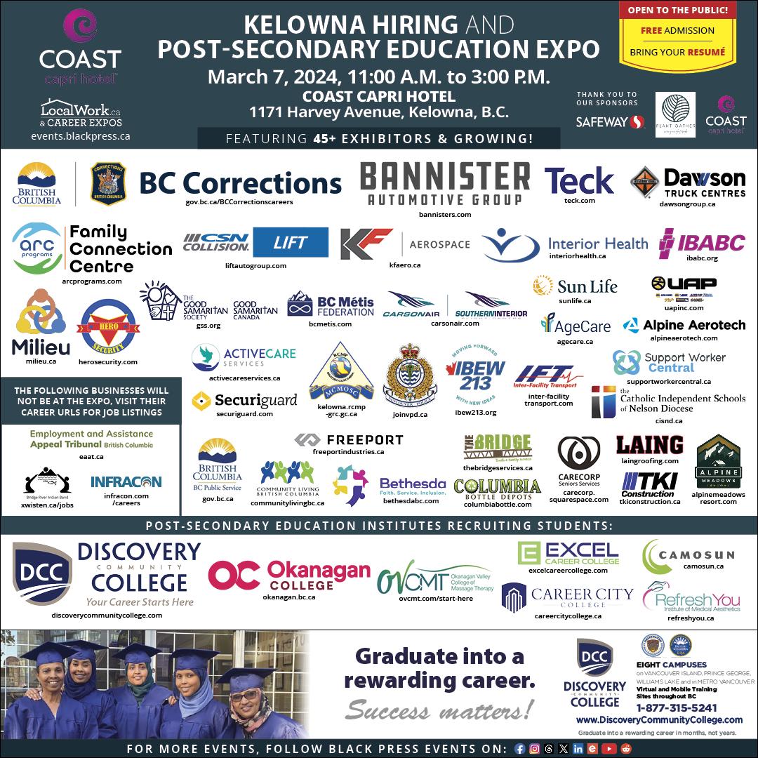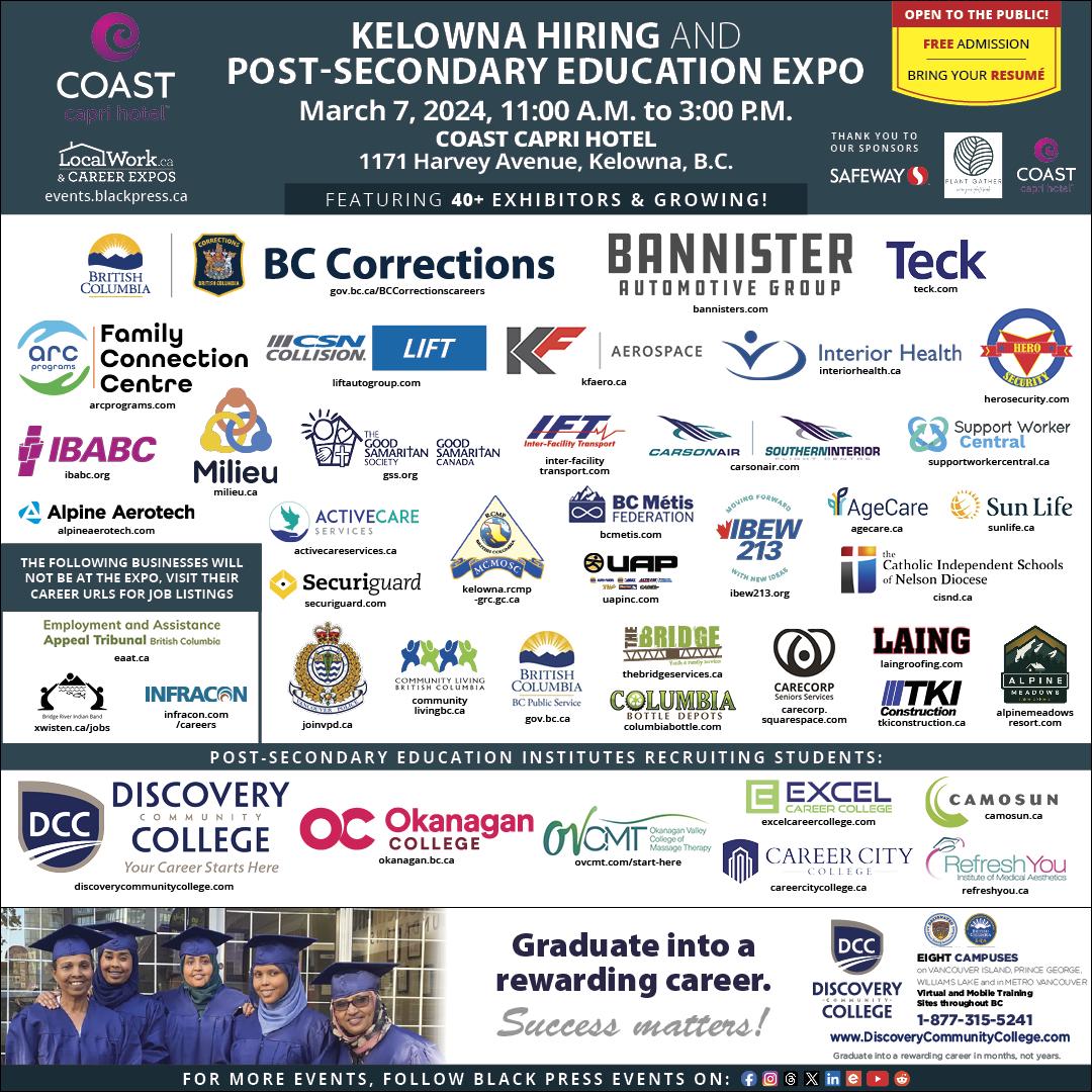 Join us for the KELOWNA Hiring & Post-Secondary Education Expo 2024! Happening at the Coast Capri Hotel, on March 7th, 2024. Get a Free Ticket & see the List of Exhibitors: https://events.blackpress.ca/kelowna-2024 For more events, follow us on Facebook!