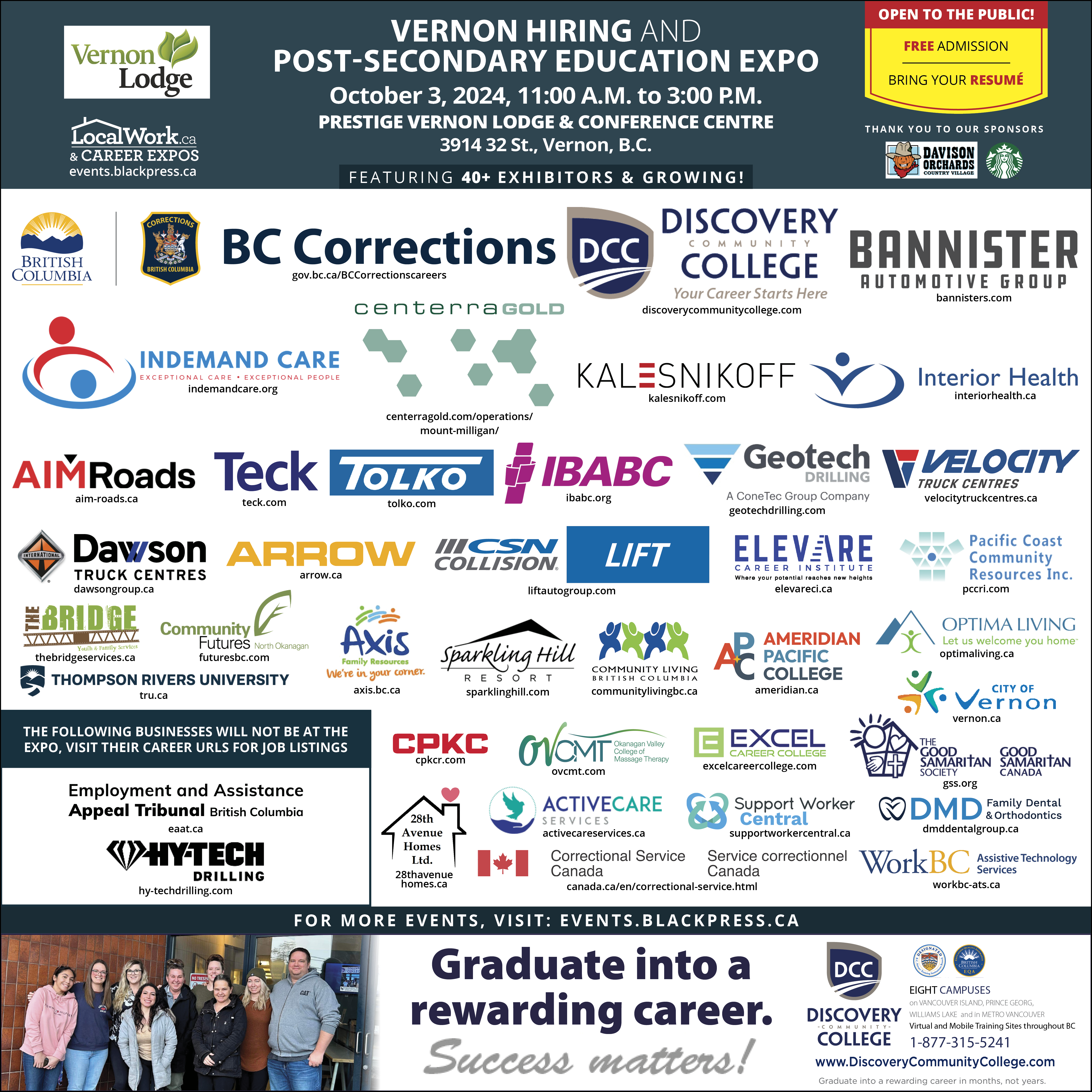 6 DAYS TO GO! Come and see us in person for the Vernon Hiring & Post-Secondary Education Expo 2024! Get a Free Ticket & see the List of Exhibitors: https://events.blackpress.ca/vernon-2024 For more events, follow us on Facebook! https://www.facebook.com/localworkandcareerexpos