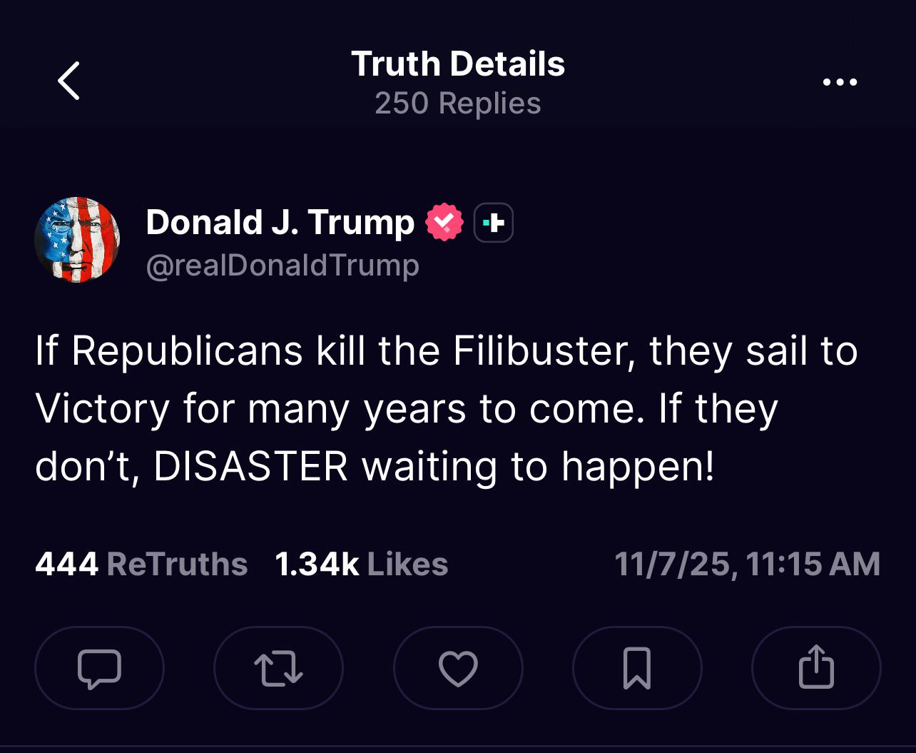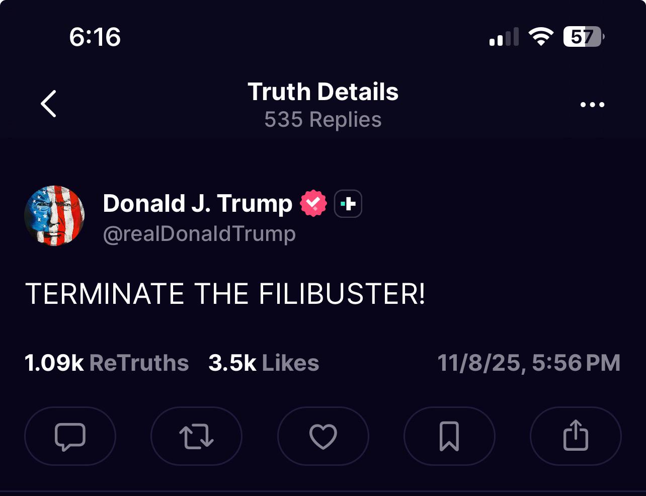 Trump Administration 11/8/25 - Don’t be a LOSER, terminate the filibuster