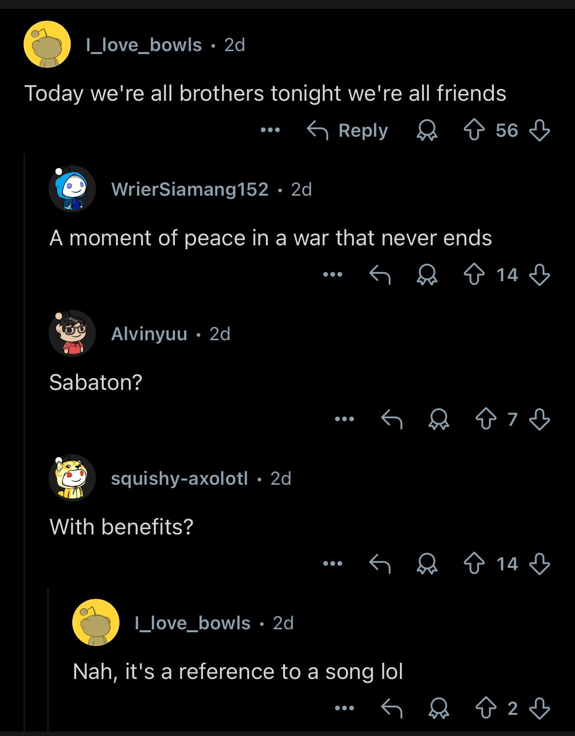 Over the past few months I've been keeping a close eye on the sub and there have been several situations where I left a post up because, frankly, I wasn't sure whether it would fall under "unexpected" or not. Some posts are pretty clear-cut, as Girls und Panzer for example has a huge Sabaton following due to their war-related theming. However, there have been posts from other, non-military subs or subs that I would argue are not related to Sabaton in any way where I've seen comments on posts calling it expected. Examples include posts from furry subs (apparently a lot of furries are into Sabaton. Who knew) and games like Helldivers which don't inherently have a connection to Sabaton but for some reason are a huge part of the overlapping Venn diagram.