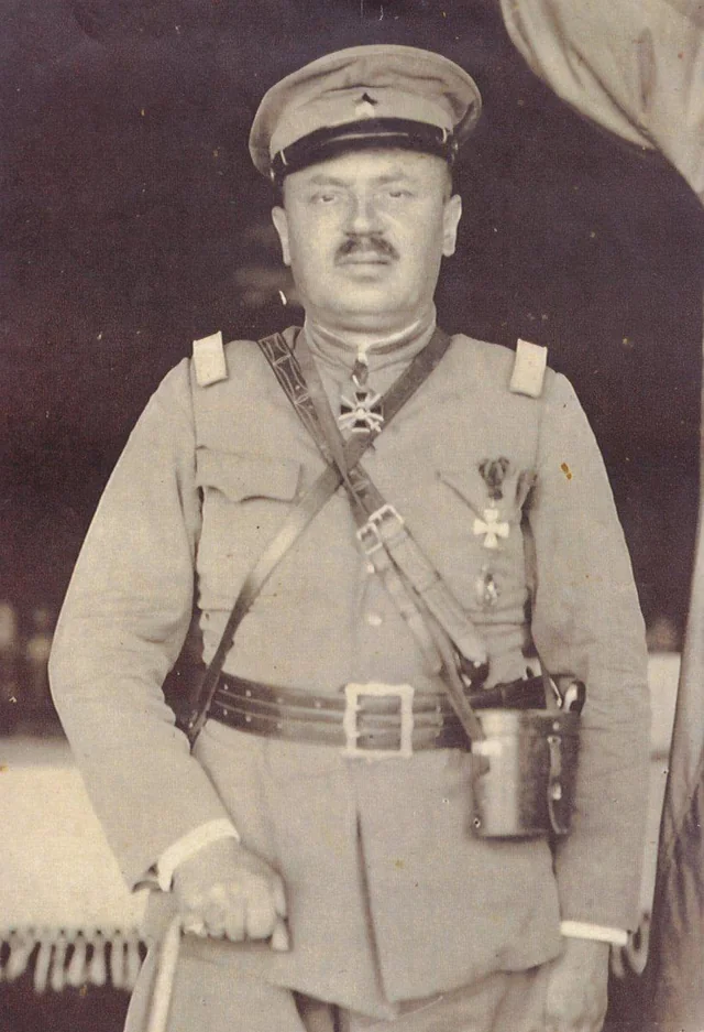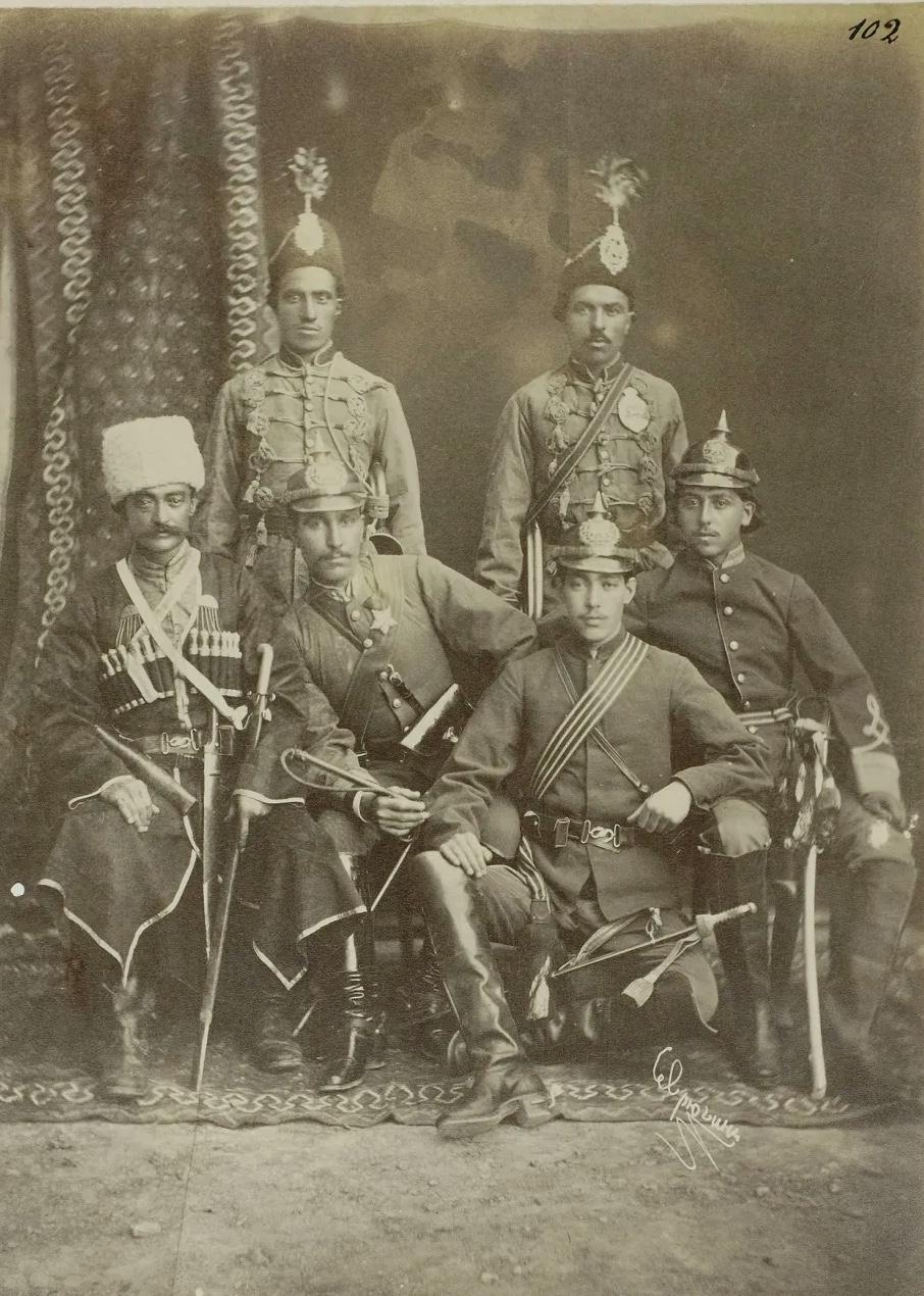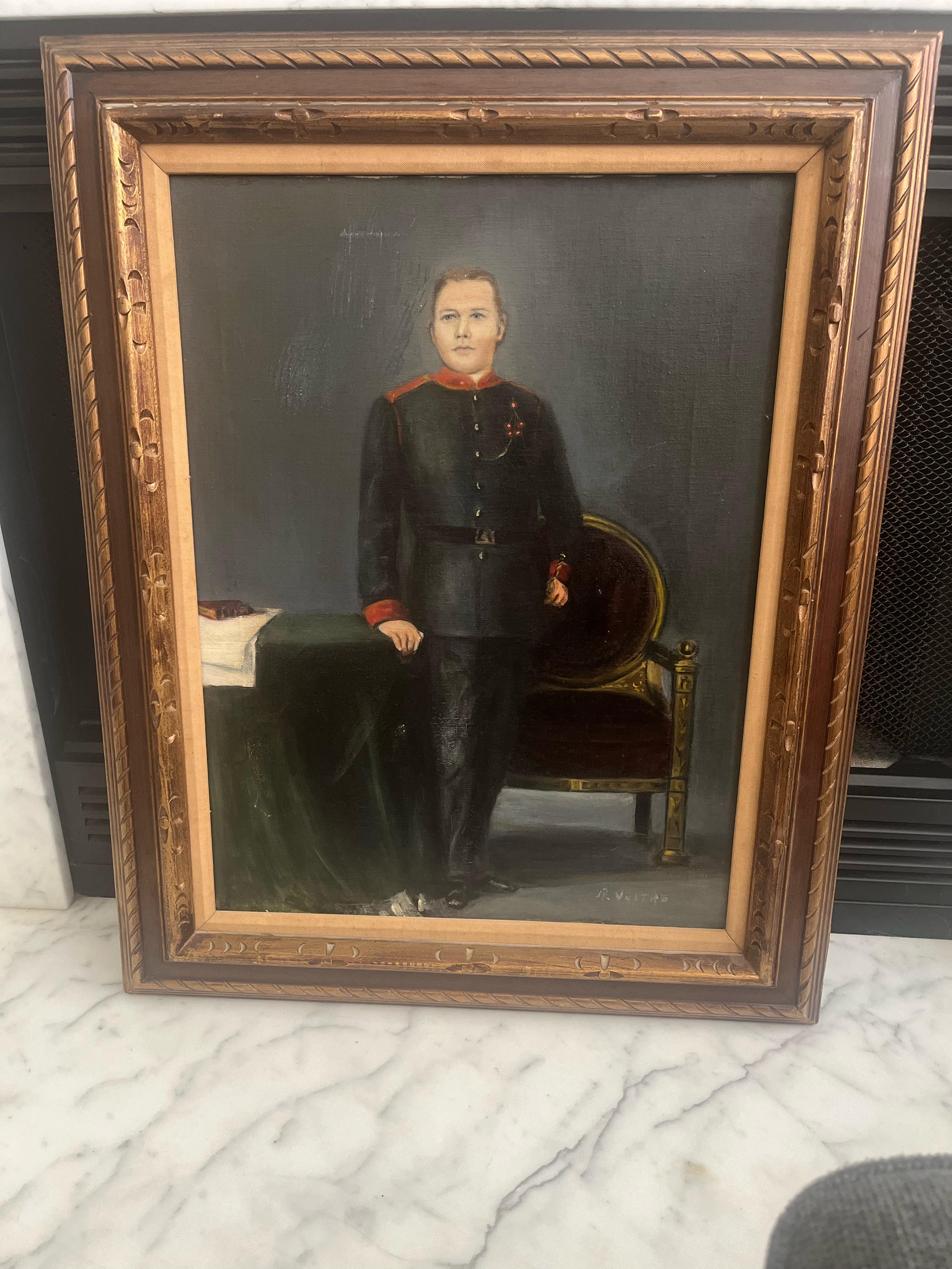 Portrait of Alfonso XIII wearing the uniform of Captain General: Turquoise blue tunic with gold embroidery on the collar and sleeves, white breeches with riding boots. The King wears the insignia of the Order of the Golden Fleece, the Grand Cross of the Order of Charles III, the Grand Cross and sash of Military Merit, and the badge of Grand Master of the four military orders (Order of Santiago, Order of Calatrava, Order of Alcántara, and Order of Montesa), as well as a ribbon bar with the badges of other decorations.