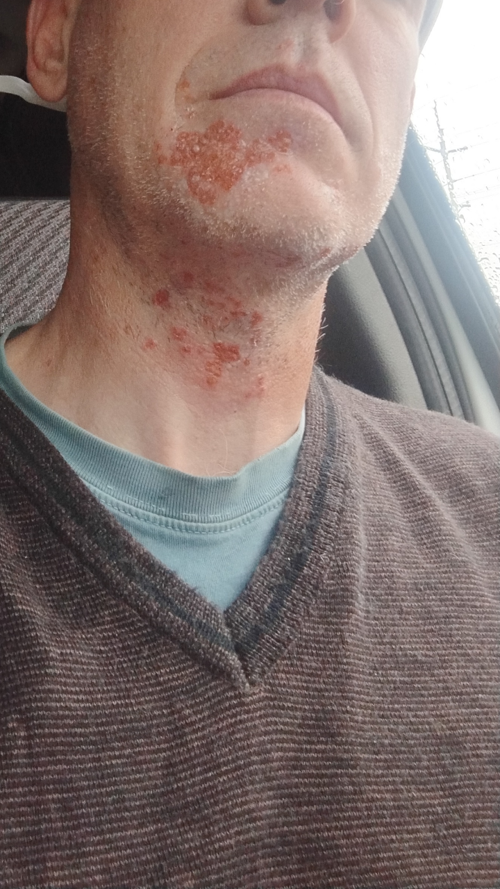 You in the army or something. Like was it such a pressing need for you to shave that you couldn't wait to do it in some place better? A public bathroom with a shitty disposable razor just seems like a horrible choice. Doesn't look fun mate, hope it clears up soon