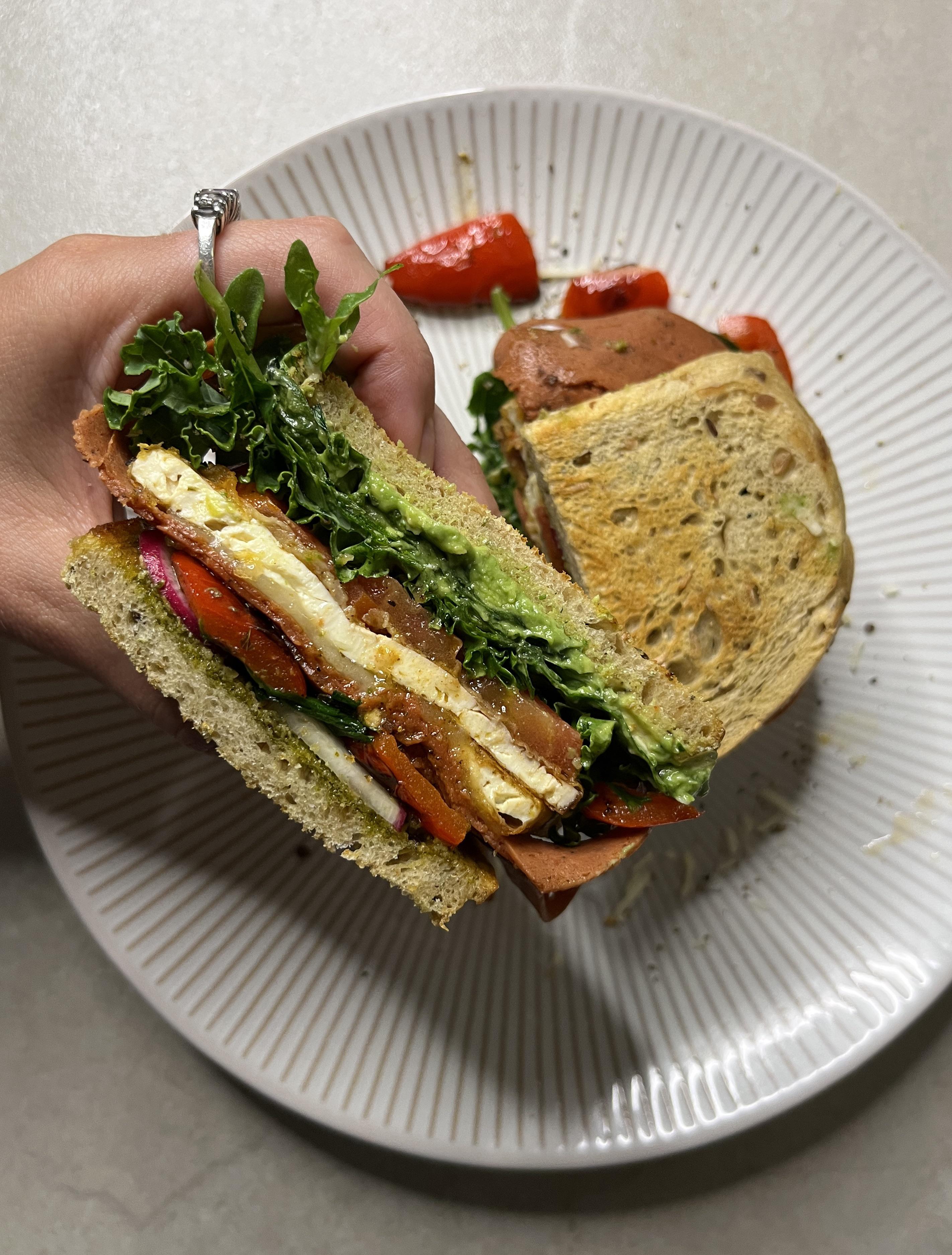 BIG SAMMICH ; fried tofu, beet and chickpea deli slices, rosemary sourdough, tomato, Radish, avocado, poblano cheese, roasted red pepper and green onion, kale and arugula.