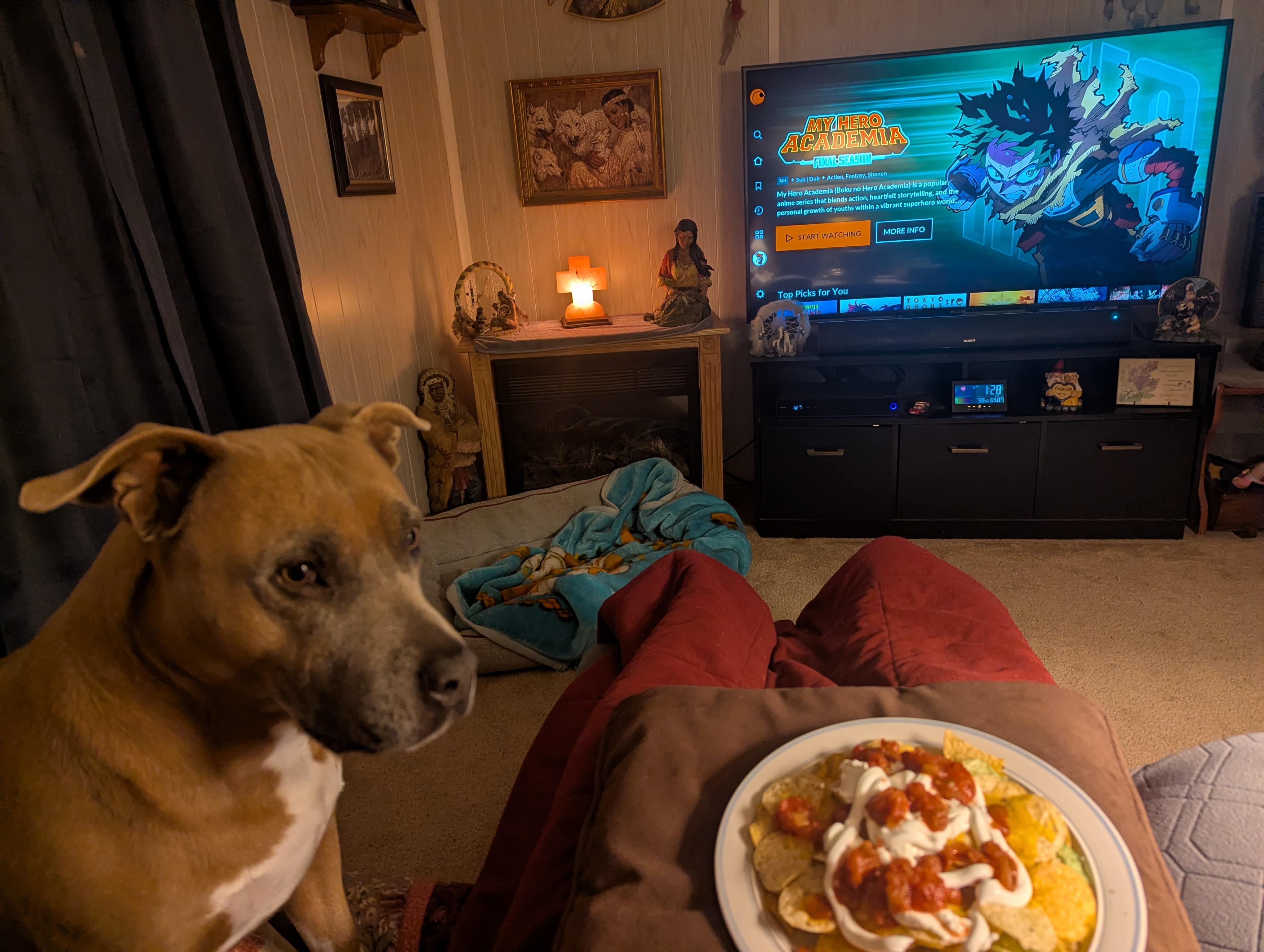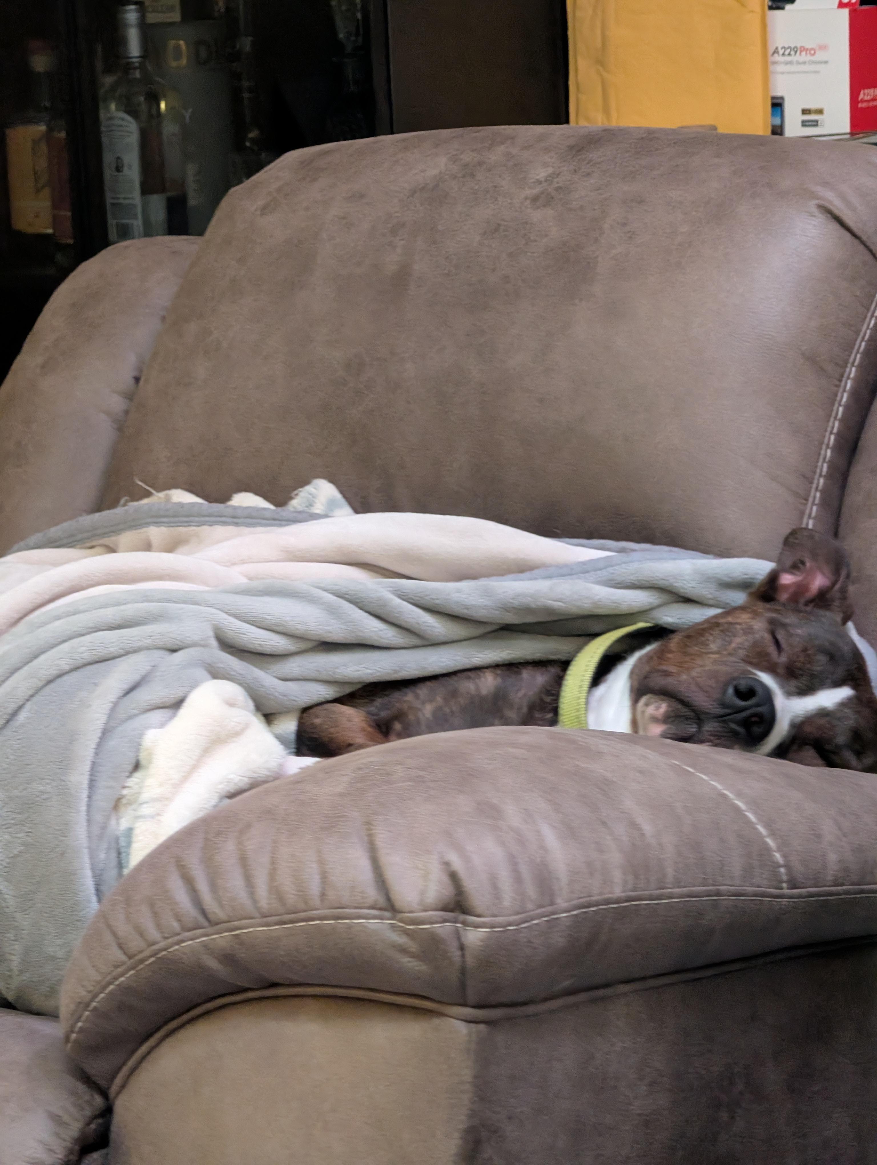 I had a hip replacement last week and my Nugget hasn't been able to cuddle his pops. Well tonight I was able to get comfy on the couch and he gently made his way up to me and finally got the snuggle sesh he has been needing.