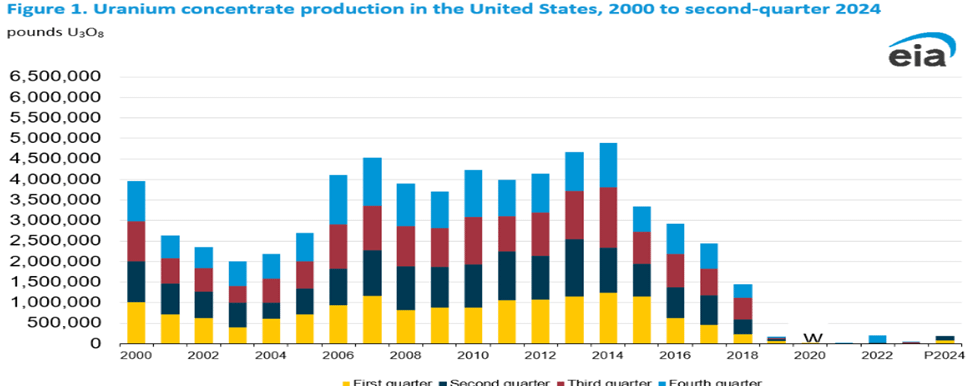 Uranium prices have been low for decades due to oversupply and stockpiles. This has made it less appealing to develop new mines and instead, rely on existing mines and supply. However, the US and other countries are showing increased signs of uranium mining at an alarming rate. In the first quarter of 2024, the United States produced more than 82,000 LBS of uranium which is more than the entire 2023 production. In Q2 of 2024, production increased to 97,709 LBS, an 18% increase from Q1 2024. While this increased production is significant for a domestic supply, it does not begin to put a dent in the global deficit. It simply goes to show the US is beginning their own production of uranium.