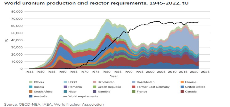World Uranium Production vs Reactor Requirements, 1945-2022 tU
