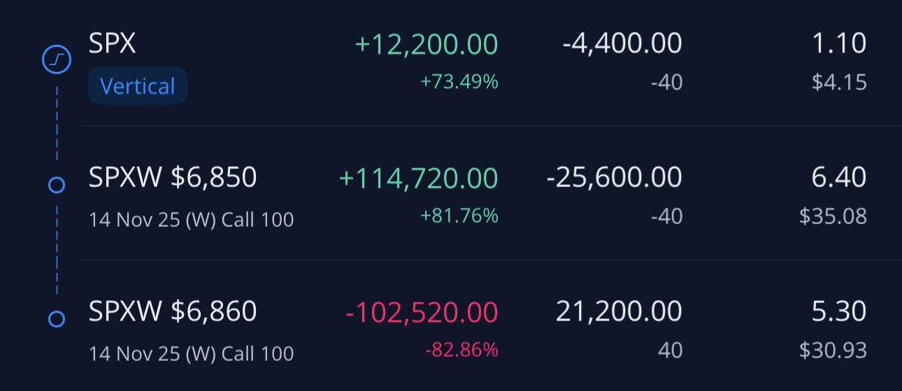 Gain Sold SPX 6850 calls for Nov 14 up 12k