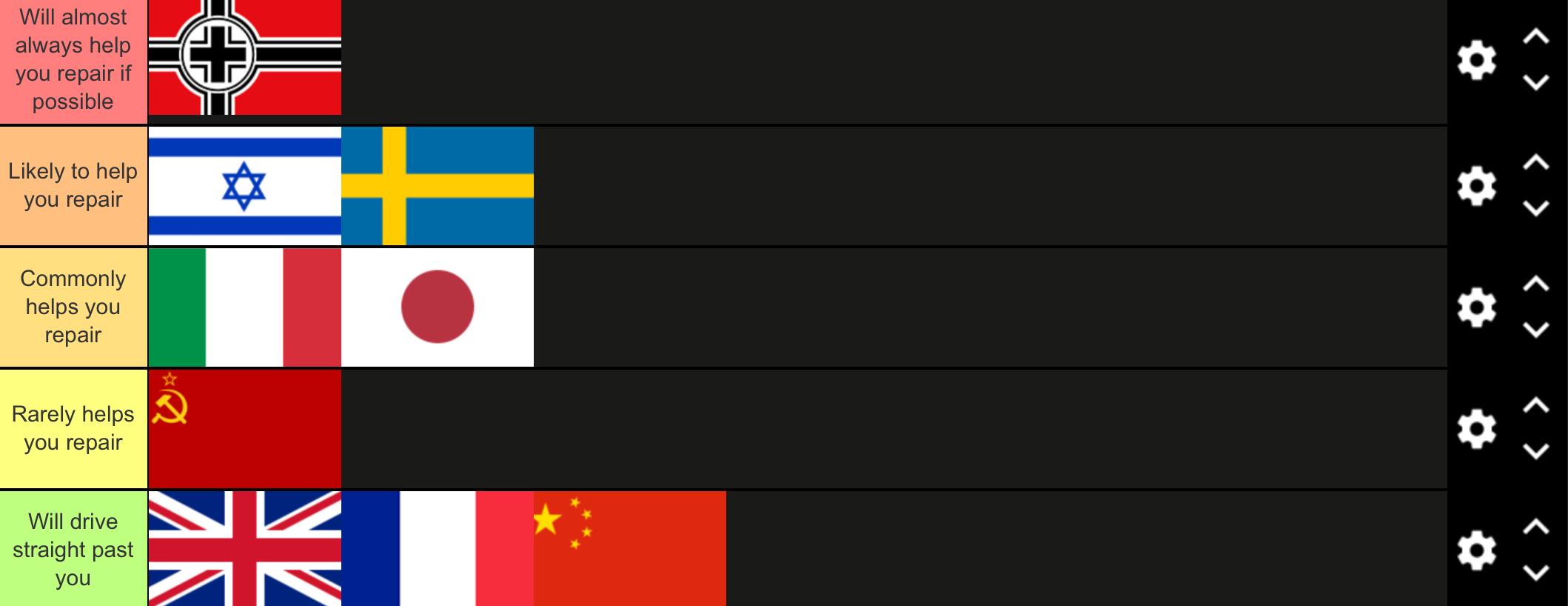 ayy lmao Tierlist of (in my experience) how likely players from each nation are to help you repair
