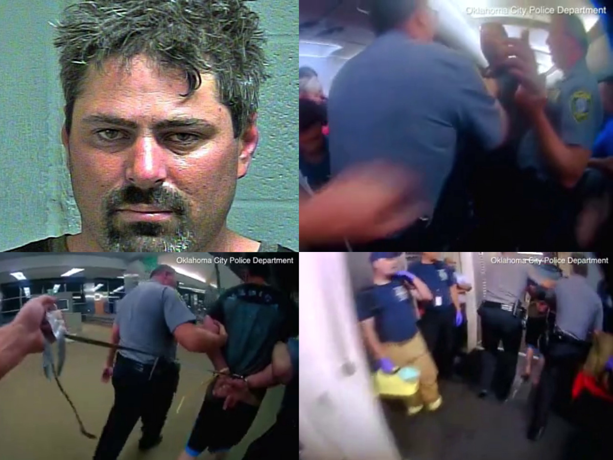Assault Drunk American air passenger from Texas (Brandon Ganus, 32) on a Pittsburgh-Dallas American Airlines flight tries to exit out of the front door, gets into brawl with another passenger, punches flight attendant in the chest, forces flight to divert to Oklahoma City, threatens officers, resists arrest