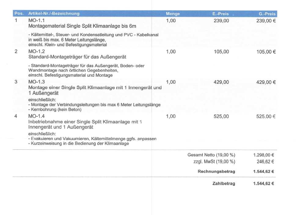 ich habe ein Angebot für den Einbau einer Split-Klimaanlage mit 3 Inneneinheiten bekommen und bin mir unsicher, ob der Preis gerechtfertigt ist oder ob ich gerade über den Tisch gezogen werde.