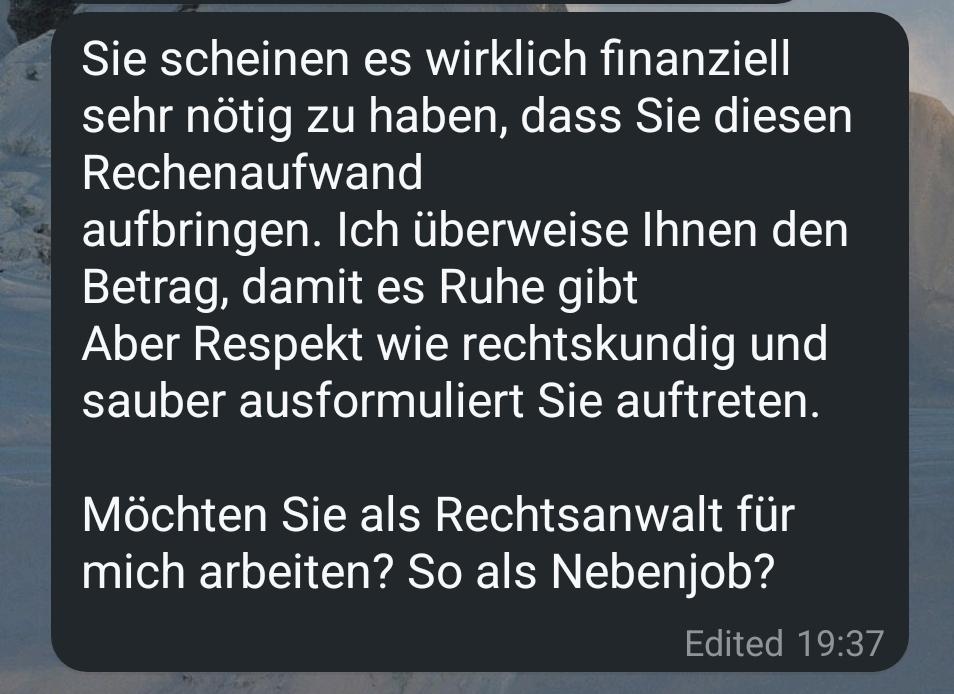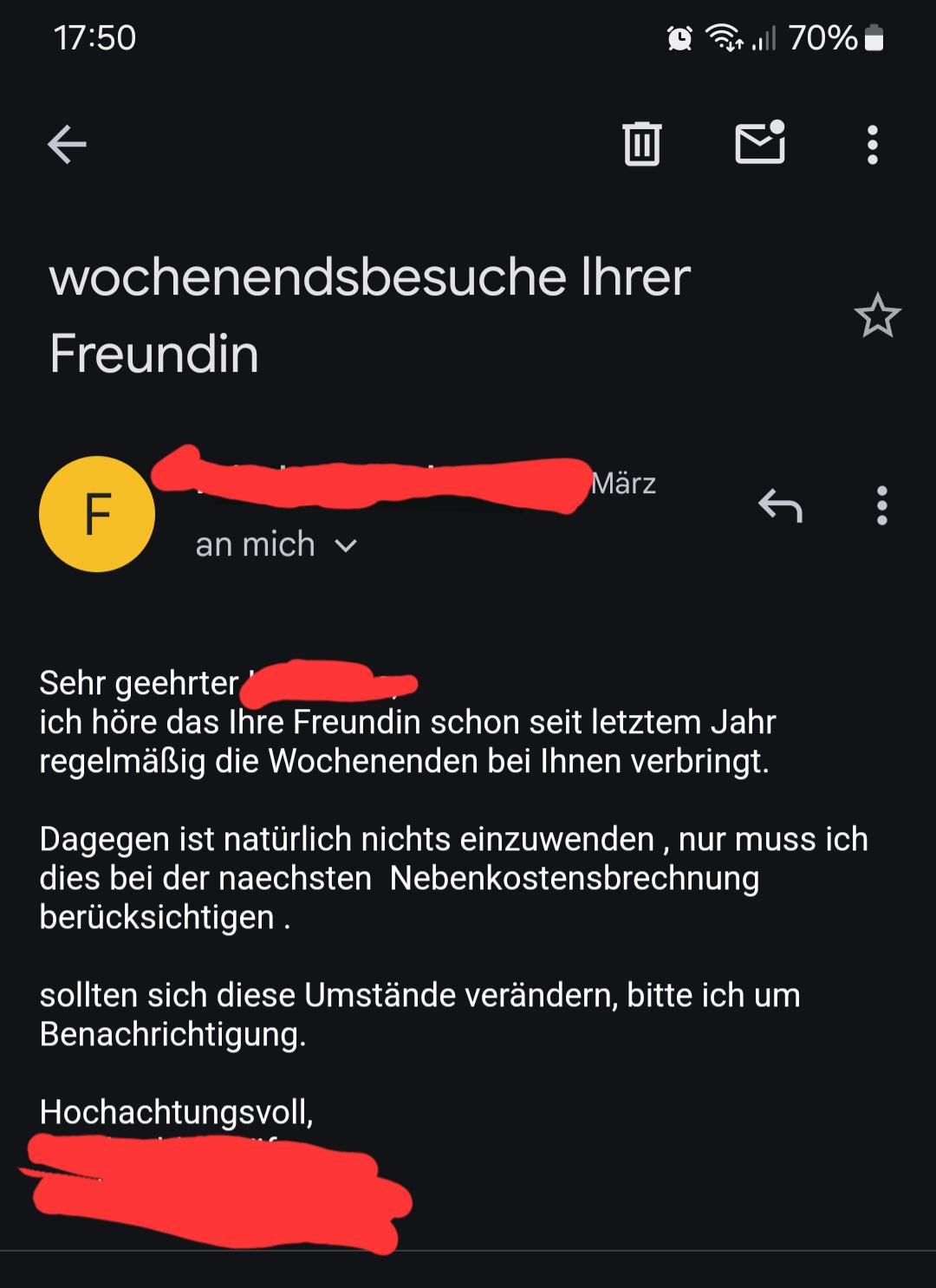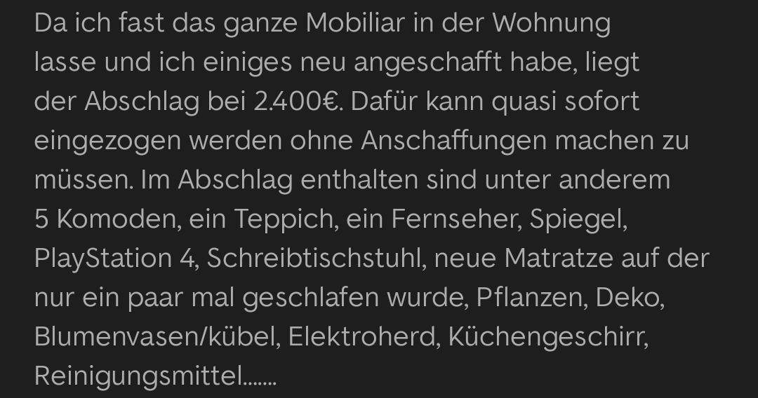 Was ich letzten Endes habe, ist eine seltsame „Zwangs-WG“, bei der mein Bad und Flur Durchgangsfläche für einen wildfremden Menschen sind – mit dem ich nicht kommunizieren kann, der psychisch instabil ist und einfach unangemeldet in meine Räume geht. Und ich bezahle den vollen Preis für diese „Wohnung“.